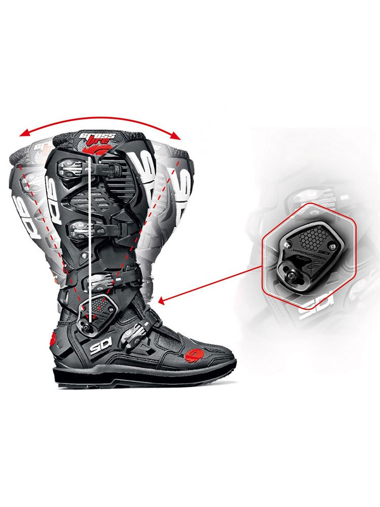 Sidi Crossfire 3 to technologicznie zaawansowane buty motocyklowe które świetnie sprawdzą się podczas off'roadowej jazdy w terenie. Wykonane są z odpornej na przetarcia, przebicia i rozwarstwienia syntetycznej skóry Lorica. Materiał ten jest bardzo lekki i miękki dzięki czemu znacznie zwiększa komfort użytkowania obuwia. Wewnętrzna część z materiału Cambrelle połączona została z oddychającą teflonową siateczką, która umożliwia sprawne odprowadzanie wilgoci zapobiegając tym samym powstawaniu nieprzyjemnych zapachów. Crossfire 3 wykorzystuje cztery klamry mikrometryczne z jednym punktem mocowania, dzięki czemu w prosty sposób można dostosować go do indywidualnych potrzeb w obszarze stopy i goleni. System Hyper Extension Block zapobiega nadmiernemu przeprostowi kostki oraz ścięgna Achillesa, w pozycji gdy stopa zgięta jest do przodu lub do tyłu zapewniając tym samym wysoki poziom bezpieczeństwa. Wymienna płytka wykonana z PU i gumy chroni nogę przed poparzeniami od motocykla. Ochronę zapewniają anatomicznie ukształtowane protektory pięt, panel chroniący śródstopie oraz sztywne wzmocnienia palców zakończone metalową płytką. Podeszwa wykonana została z odpornej na działanie olejów, antywstrząsowej gumy.