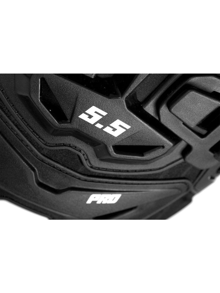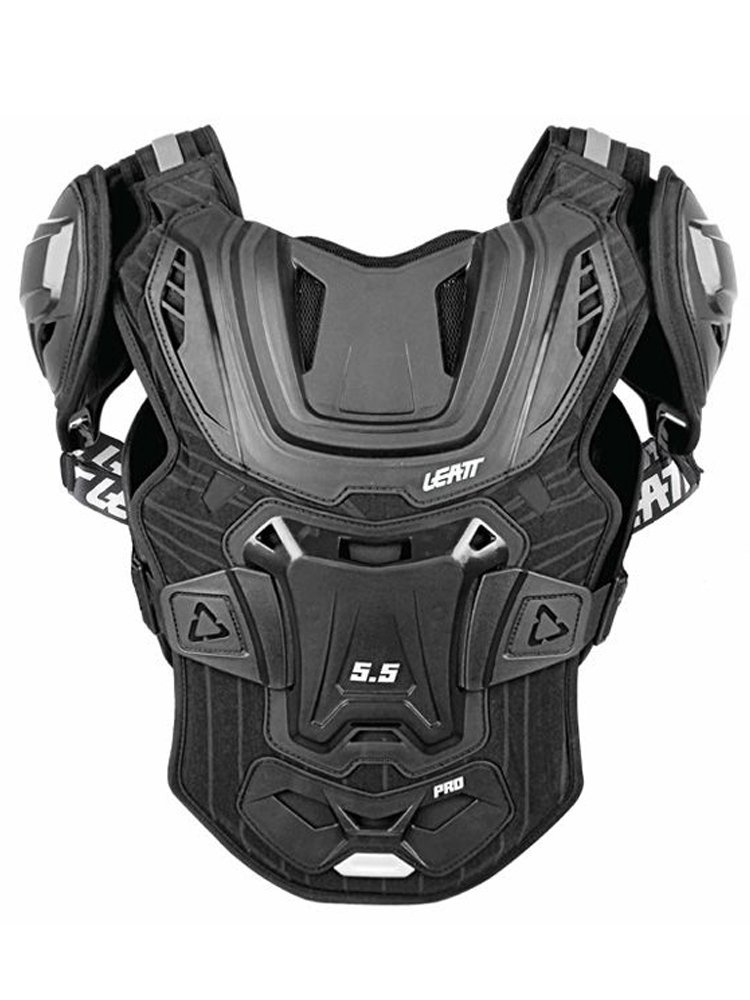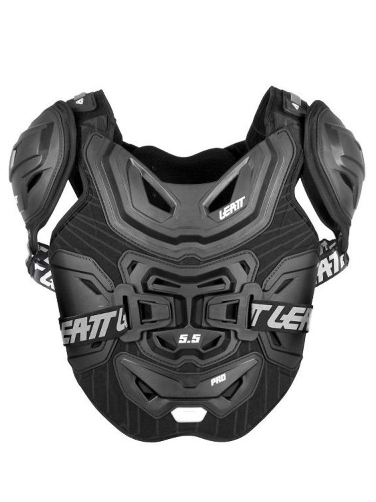 Leatt 5.5 Pro to wytrzymały ochraniacz klatki piersiowej wyposażony w szereg protektorów wzmocnionych absorbującą energię uderzenia pianką 3DF AirFit. Baza oraz połączenia z siateczki mesh sprawiają, że całość jest bardzo lekka i przewiewna nie tracąc jednocześnie na ochronie. Za bezpieczeństwo odpowiadają protektory klatki piersiowej, pleców i barków. Oprócz certyfikatu CE, zbroja na crossa Leatt zawiera Certyfikat Międzynarodowej Federacji Motocyklowej (FIM) oraz Certyfikat Francuskiej Federacji Motocyklowej (FFM). Konstrukcja 3D z regulowanymi panelami na ramionach umożliwia lepsze indywidualne dopasowanie do użytkownika oraz zwiększa komfort. Leatt 5.5 HD jest kompatybilny ze stabilizatorami karków BraceOn™ oraz można nosić go pod jak i na bluzie. Liczne otwory wentylacyjne zapewniają optymalny przepływ powietrza.