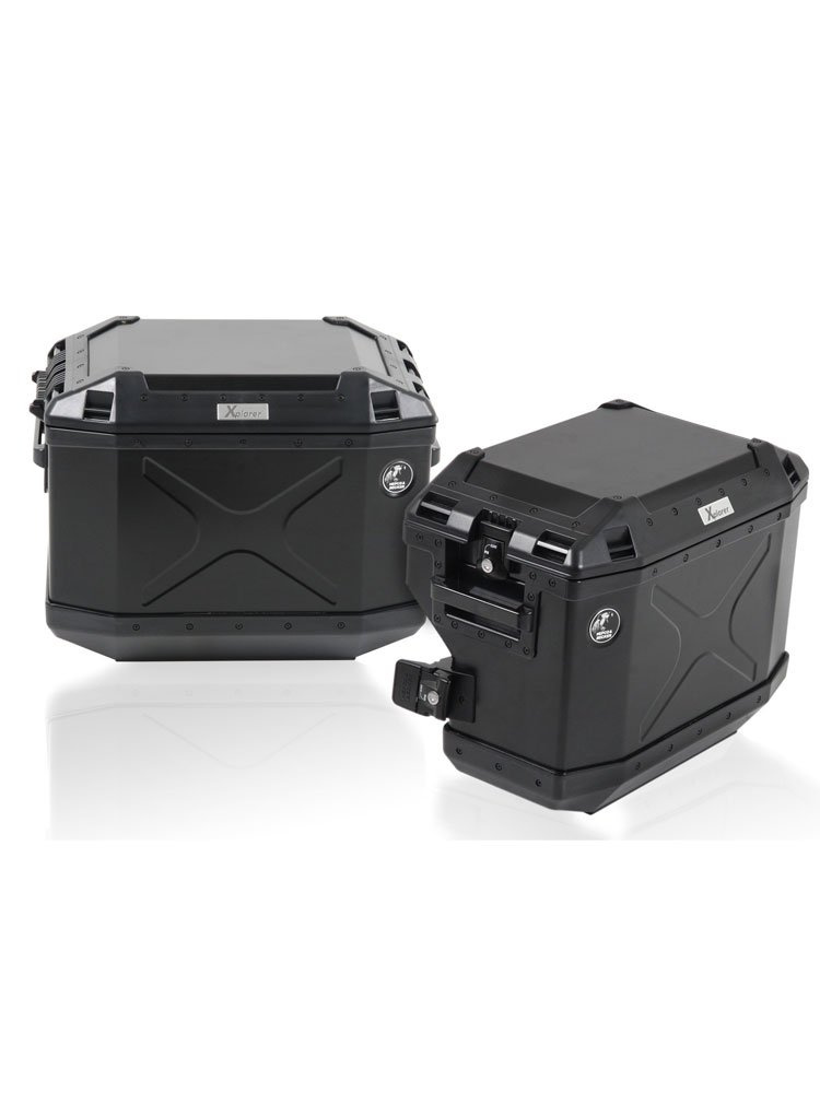 - zestaw kufrów bocznych Xplorer Cutout wraz ze stelażem bocznym (na prawą i lewą stronę) ze stali nierdzewnej,