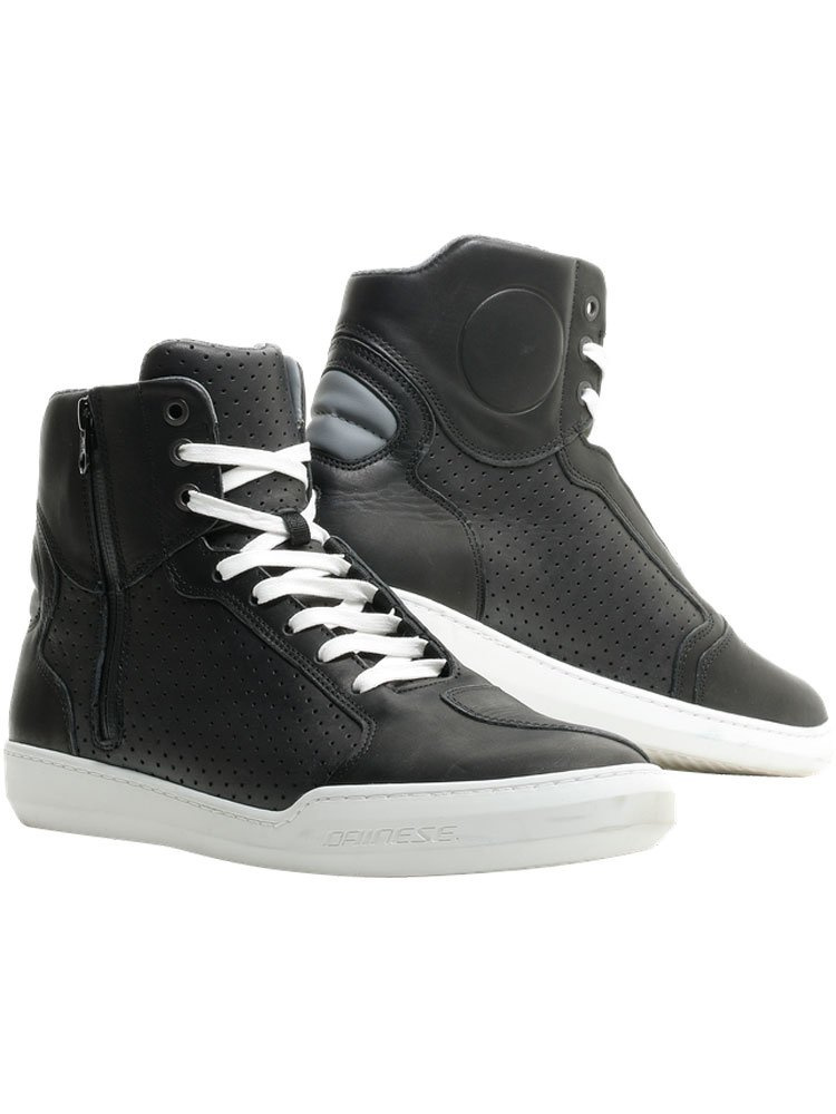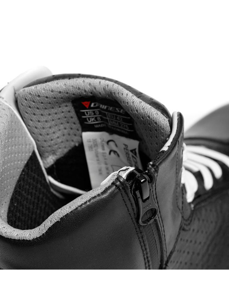Stylowe, certyfikowane buty marki Dainese - zaprojektowane i wykonane z myślą o jeździe po mieście. Posiadają podwójne zapięcie - sznurowadła i zamek błyskawiczny - dla lepszego, bardziej komfortowego dopasowania. Buty posiadają certyfikat CE - Cat. II - EN 13634 co oznacza, że zostały odpowiednio przetestowane i mamy pewność, że nasze stopy są należycie zabezpieczone. Komfortowe wnętrze z oddychającego meshu i perforowana cholewka sprawiają, że ten model sprawdzi się podczas wysokich temperatur. Specjalna struktura podeszwy utrzymuje stabilnie stopy zarówno na podnóżku podczas jazdy jak i na asfalcie podczas postoju. Wygodne i lekkie, nie powodują zmęczenia przez co można w nich spędzić wiele godzin.