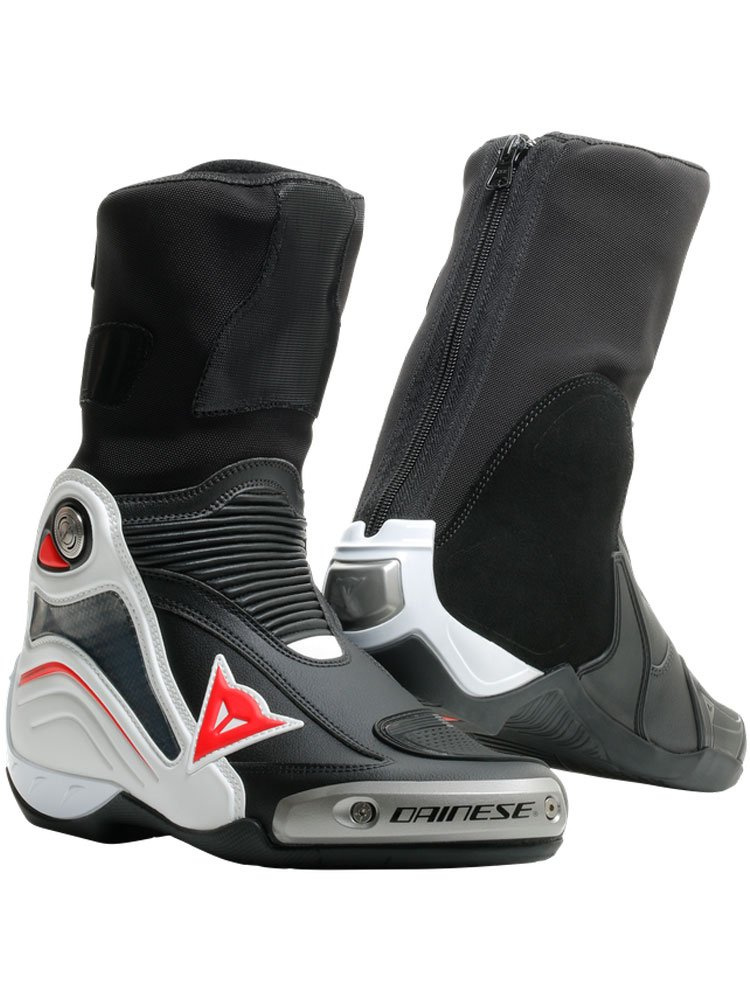 Buty motocyklowe Axial D1 to buty sportowe od marki Dainese, które świetnie sprawdzą się na torach wyścigowych. Stworzone z myślą o motocyklistach, którzy uwielbiają szybką i dynamiczną jazdę motocyklem po torach wyścigowych. Wykonane ze skóry bydlęcej, która posiada znakomite właściwości zwiększające elastyczność obuwia oraz wytrzymałej tkaniny D-Stone™. Mówiąc o butach Axial D1 nie sposób nie wspomnieć o innowacyjnym systemie D-Axial, który został opracowany przez Dainese. System ten zabezpiecza staw skokowy przed skręceniem oraz zapewnia ochronę stopie i goleniu przed uszkodzeniami zewnętrznymi poprzez odpowiednie rozprowadzenie siły uderzenia w czasie upadku na motocyklu. Ważny aspekt stanowi również bezpieczeństwo, które zapewnią wstawki metalowe oraz wykonane z nylonu okolice pięty i osłony palców, a elastyczne wstawki i system zamykania na zamek błyskawiczny zapewnią optymalne dopasowanie.