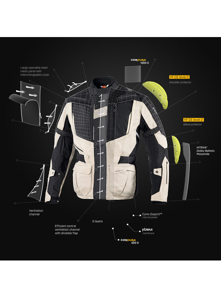 Damska kurtka motocyklowa tekstylna Hardy II wykonana jest z mocnej i trwałej Cordury®, która wyróżnia się bardzo dobrą odpornością na rozdarcie i ścieranie. Solidna konstrukcja wzmocniona jest dodatkowo w newralgicznych miejscach Poliamidem 450D oraz podwójnymi i potrójnymi szwami. Posiada liczne zamki wentylacyjne, które pozwalają na dopływ chłodnego powietrza. Przed niekorzystną pogodą ochronę zapewni wyjmowana i wodoodporna membrana Humax® oraz odpinana podpinka ocieplająca. W zestawie z kurtką otrzymujemy certyfikowane ochraniacze łokci i ramion YF oraz ochraniacz pleców Sas-Tec. Bezpieczeństwo pasywne wspomagają odpowiednio rozmieszczone elementy odblaskowe. Kurtka jest wygodna w noszeniu, nie krępuje ruchów dzięki elastycznym i rozciągliwym wstawkom. Idealne dopasowanie uzyskamy za pomocą obszernego systemu regulacji. Jako kurtka turystyczna posiada szereg kieszeni, w których pomieścimy niezbędne osobiste rzeczy. Przydatnym elementem są zamki w pasie, które służą do spięcia kurtki ze spodniami motocyklowymi.
