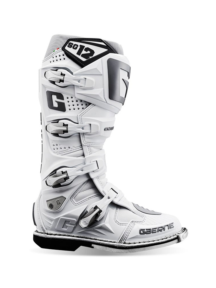 Gearne przedstawia model SG 12 - innowacyjne buty motocyklowe wyposażone w dwuosiowy system Dual Stage Pivot, który kontroluje ruch kostki chroniąc ją tym samym przed urazami. W ramach ochrony na piętach zastosowano absorbujący energię uderzenia protektor, a także pozwalające na poszerzenie obwodu łydek ochraniacze. Przednia część buta dostostosowana została do komfortowej obsługi dźwigni zmiany biegów. Gumowa łata umieszczona po wewnętrznej stronie buta chroni użytkownika przed ciepłem motocykla. Zapięcie składa się z czterech regulowanych klamr poprawiających dopasowanie na całej powierzchni buta. Cholewka wykonana została z odpornej na przetarcia i przebicia wysokiej jakości skóry. Materiał Acronos® poprawia mobilność oraz zapewnia optymalny przepływ powietrza. Wnętrze wyposażone zostało w oddychającą wyściółkę oraz miękką wkładkę dopasowującą się do stopy. W tylnej części umieszczono absorbującą energię wstawkę. Gumowa podeszwa „Dual Composite” zapewnia świetną przyczepność w każdych warunkach przy czym świetnie tłumi drania przenoszone przez motocykl.