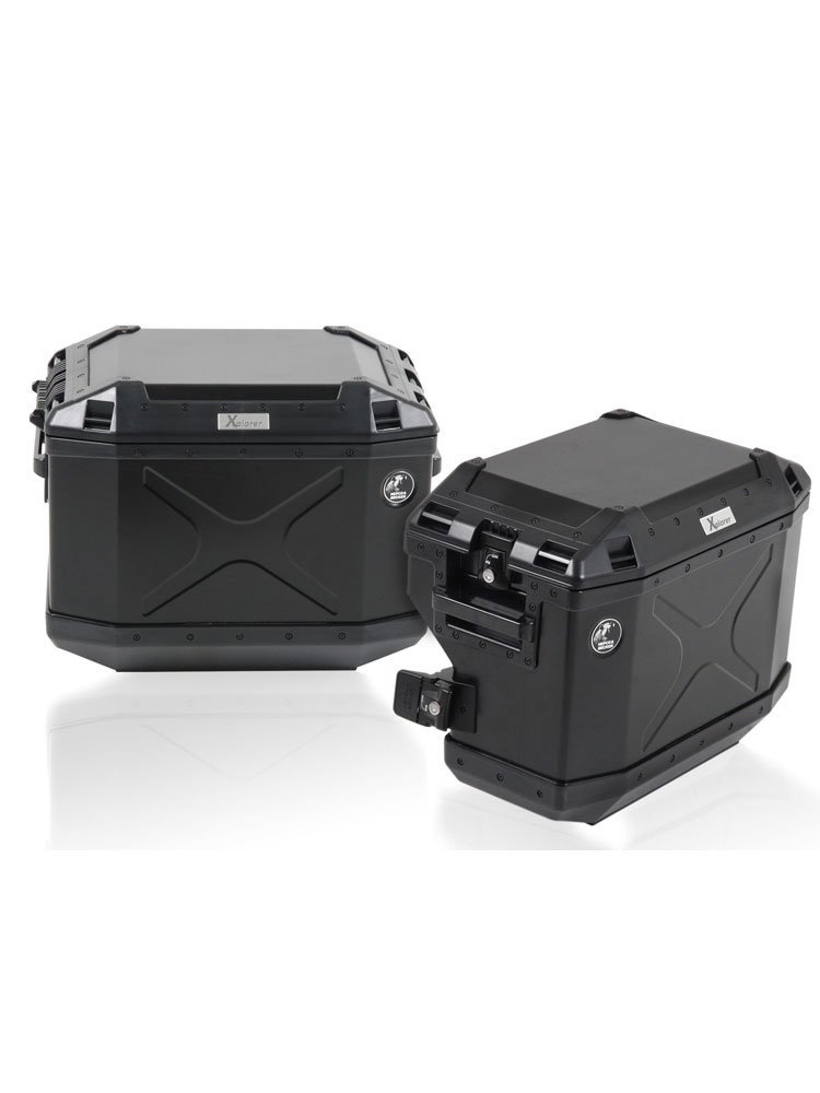- zestaw kufrów bocznych Xplorer Cutout wraz ze stelażem bocznym (na prawą i lewą stronę) ze stali nierdzewnej,