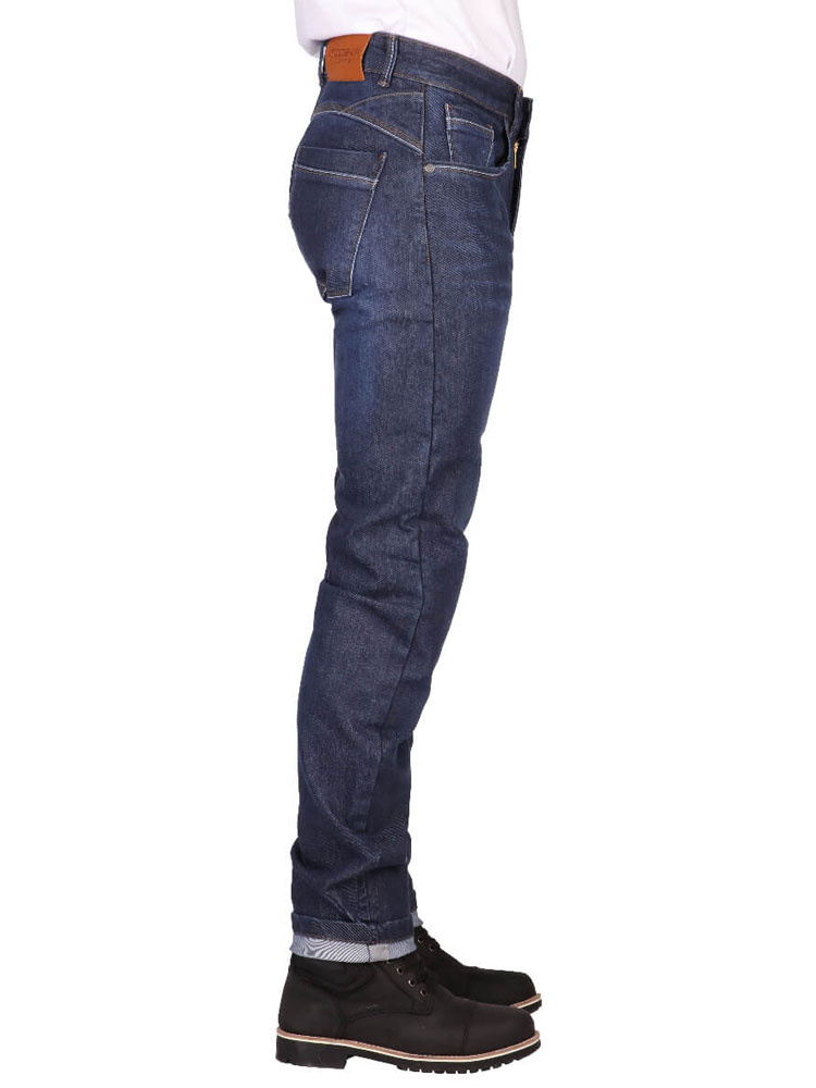 Jeansy motocyklowe Nyle Cool to model, który nie sposób odróżnić od zwykłych jeansów. Zapewniają idealne dopasowanie oraz dyskretną ochronę. Będą doskonałym wyborem do spokojnej jazdy miejskimi ulicami. Jeansy uszyte zostały z połączenia wysokiej jakości bawełny z mocną Cordurą® oraz włóknem Coolmax®. Bawełna sprawia, że spodnie są wygodne w noszeniu, Cordura® gwarantuje doskonałą ochronę przed przetarciem i ścieraniem, a Coolmax® skutecznie reguluje temperaturę poprzez odprowadzenie wilgoci na zewnątrz z dala od skóry. Jeansy posiadają od wewnątrz wzmocnienia z włókna aramidowego na kolanach, siedzisku oraz biodrach, które znacznie zwiększają odporność jeansów na ścieranie. Ważnym elementem będącym na wyposażeniu jeansów są certyfikowane ochraniacze kolan SAS-TEC®. Są niezwykle cienkie i elastyczne dzięki czemu zapewniają ochronę, która nie rzuca się w oczy oraz wygodne użytkowanie. Opcjonalnie możesz zastosować dedykowane ochraniacze bioder również z serii SAS-TEC®. W większości jeansów motocyklowych elementy odblaskowe umieszczone są po wewnętrznej stronie nogawki. Tak też jest w modelu Nyle Cool.