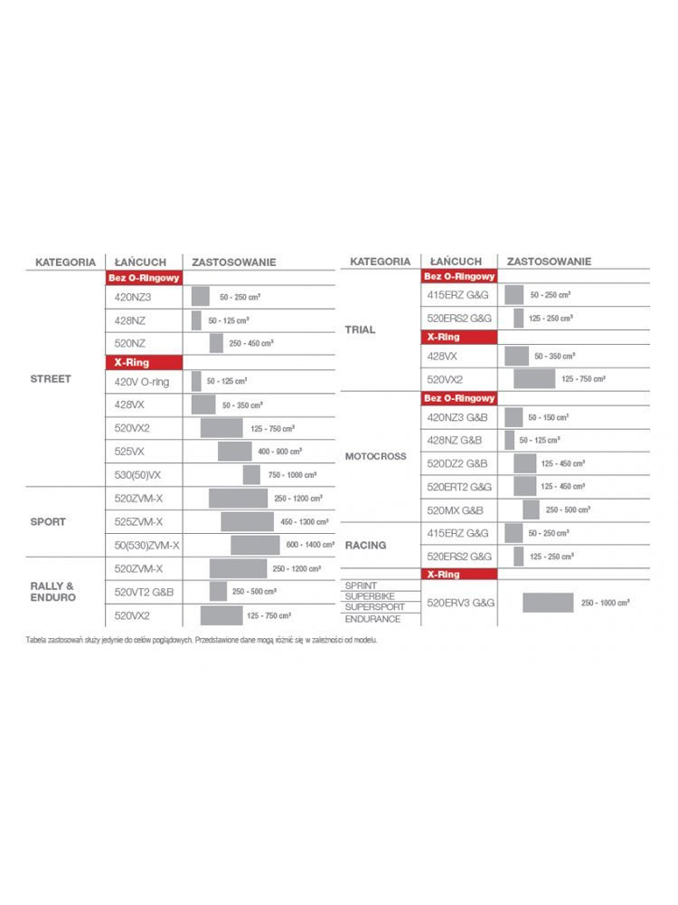 Łańcuchy z serii VX gwarantują około 50% mniejsze opory tarcia a ponadto są łańcuchami o większej odporności na zużycie eksploatacyjne w porównaniu z łańcuchem O-ringowym. Wysoka odporność na odkształcenia i rozciągnięcie łańcucha.