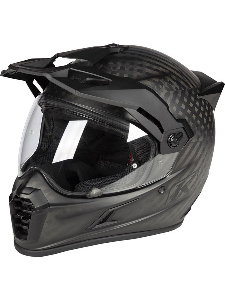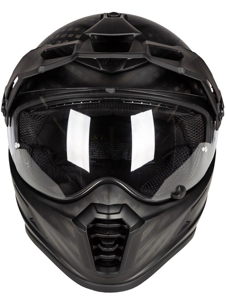 Kask integralny Klim Krios Karbon Pro to kask, który podnosi standardy komfortu, wydajności i przepływu powietrza, dzięki zastosowaniu innowacyjnych rozwiązań. Oferuje wysoki poziom ochrony dzięki zastosowaniu nowoczesnego wypełnienia, jakim jest materiał kopolimerowy koroyd. Materiał ten jest niezwykle lekki, dobrze wentylowany oraz doskonale pochłania energię uderzenia. Zewnętrzna skorupa wykonana jest z ręcznie układanych włókien karbonowych, które cechuje niezwykła wytrzymałość. Kask bezpiecznie utrzymuje się na głowie dzięki magnetycznemu zapięciu Fid-Lock®. W pełni regulowany wlot na brodzie oraz na czole zapewniają skuteczną wentylacją. Wyloty powietrza odpowiedzialne za odprowadzenie ciepłego powietrza umieszczone są po dwa w spojlerze oraz w kołnierzu. Wyściółka kasku wykonana jest z antybakteryjnego i oddychającego materiału Klimatek™. Poduszki policzkowe są wyjmowane, a dzięki różnej grubości możesz je dopasować do swoich potrzeb. W standardzie otrzymujesz dwa wizjery przezroczysty Pinlock-Ready oraz fotochromatyczny Transitions, który dopasowuje się do natężenia światła. Kask jest w pełni uniwersalny i możesz go użytkować w czterech trybach ADV z zamontowanym daszkiem i wizjerem, szosowym ze zdjętym daszkiem i założonym wizjerem, off-roadowym ze zdjętym wizjerem, założonymi goglami i daszkiem oraz z założonym daszkiem, wizjerem oraz goglami. Ten ostatni wariat jest doskonałą opcją dla motocyklistów, którzy lubią zjechać z asfaltowej drogi na szutrową, by potem znowu wrócić na asfalt. Kask przystosowany jest do zamontowania popularnego systemu komunikacyjnego Sena 10U, dostępnego jako oddzielny produkt.