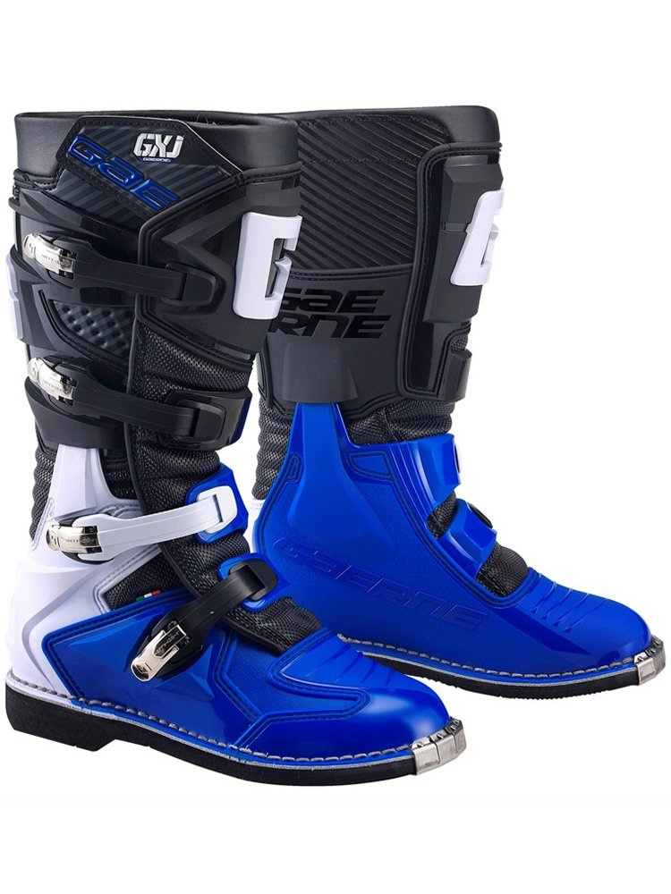 Gaerne GX-J to przeznaczone dla najmłodszych zawodników, zaawansowane buty motocyklowe wyposażone w szereg zaawansowanych rozwiązań. Bezpieczne zapięcie składające się z czterech regulowanych klamr ułatwia zakładanie oraz zdejmowanie obuwia. Warto również dodać że dwie pierwsze klamry można poluzować i przesunąć umożliwiając tym samym zastosowanie szerszej ortezy. Obszar pięty oraz palców został dodatkowo wzmocniony a na kostce znaleźć można wewnętrzny protektor z pianki. Przednia część wyposażona została w stalowe noski oraz wstawkę ułatwiającą operowanie dźwignią zmiany biegów. Na górnej części cholewki znajduje się zamszowe wytłoczenie zwiększające przyczepność oraz chroniące przed ciepłem motocykla. Sama cholewka natomiast wykonana została z wysokiej jakości skóry. Strukturalne wzmocnienia zapewniają stopie maksymalną stabilność oraz blokują ruch stawu podczas nadmiernego wygięcia. W wewnętrznej części butów znajduje się oddychająca siateczkowa podszewka oraz anatomicznie uformowana wkładka. Gumowa antypoślizgowa podeszwa gwarantuje świetną przyczepność do każdego typu podłoża.