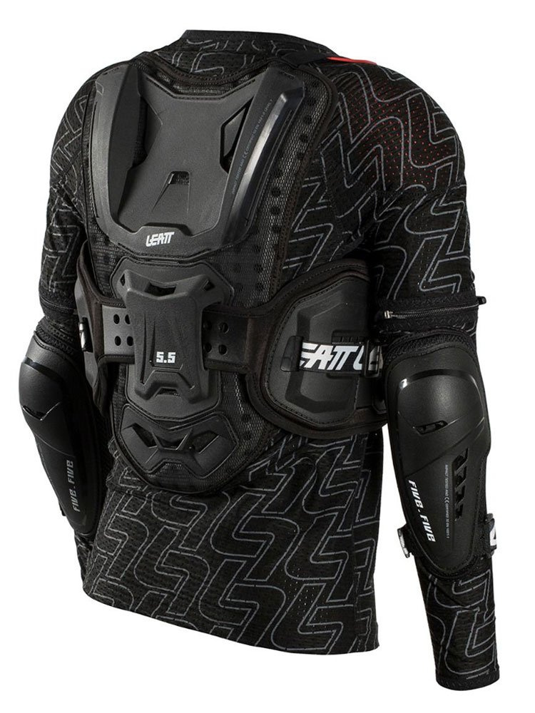 Zbroja Leatt Body Protector 5.5 wykonana jest z tkaniny MoistureCool oraz AirMesh dzięki czemu świetnie odprowadza wilgoć chroniąc przed nieprzyjemnymi zapachami oraz zapewniając wyjątkowe uczucie świeżości. Bazowym materiałem łączącym jest natomiast Meshowa siateczka dzięki której całość jest lżejsza i bardziej mobilna. Za ochronę odpowiadają protektory składające się z dwóch warst: twardej osłony wierzchniej, która chroni najważniejsze części ciała przed uderzeniami oraz przetarciami i wewnętrznej miękkiej pianki 3D AirFit skutecznie absorbującej energię powstałą podczas uderzenia przy gwarancji wysokiej wygody. Zbroja chroni klatkę piersiową, plecy, łokcie oraz boki. Aż 36 otworów wentylacyjnych dba o optymalny przepływ powietrza i idealne chłodzenie. Regulowane panele boczne oraz elastyczny pas w obrębie klatki piersiowej pozwalają na dokładniejsze i bezpieczne pozycjonowanie protektorów. Konstrukcja 3D umożliwia lepsze przyjęcie pozycji na motocyklu. Wszystkie protektory spełniają wymogi normy prEN1621.