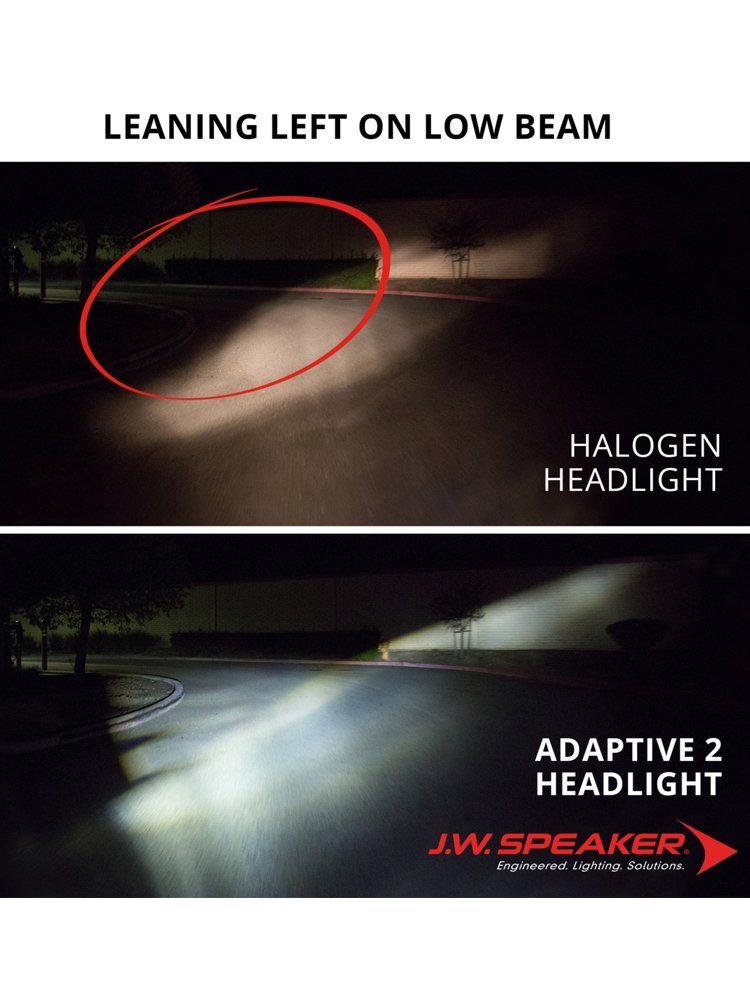 Motocyklowy reflektor LED model 8790 Adaptive 2 oblicza kąty przechylenia w czasie rzeczywistym, korzystając z zastrzeżonej technologii i czujników pokładowych, automatycznie kierując wiązkę światła w górę lub w dół, gdy motocykl pochyla się. To dodatkowe oświetlenie wypełnia luki, których tradycyjne reflektory nie potrafią. Najnowocześniejsza technologia zapewniająca doświetlenie poszczególnych rowów w celu wyeliminowania ciemnych niewidocznych stref na ostrych zakrętach i uderzenie światła o długości 1500 stóp w dół drogi, co zapewnia bezpieczniejszą i pewniejszą jazdę.