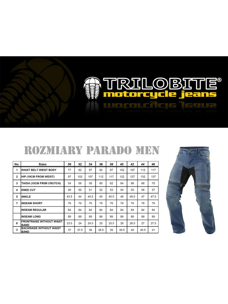Jeansy motocyklowe Trilobite Parado to spodnie, które zostały stworzone z myślą o motocyklistach, ceniących sobie uniwersalność produktu. Niezależnie od tego, czy preferujesz typową jazdę po mieście, czy też stawiasz na dalekie podróże motocyklowe, jeansy Parado w każdej z wymienionych sytuacji spełnią swoją rolę wzorowo. Niezwykle wytrzymałe i rozciągliwe, dzięki zastosowaniu bawełny i elastanu. Podszewkę spodni wykonano z super wytrzymałego materiału w postaci włókien aramidowych, które zapewniają również odporność na ścieranie. Na pośladkach i kolanach z kolei zastosowano wzmocnienia w postaci Kevlaru od firmy DuPont. W spodniach znajdziemy również certyfikowane ochraniacze bioder i kolan SAS-TEC. Ponadto protektory kolan umożliwiają regulację ich wysokości. Certyfikat CE jest potwierdzeniem, że spodnie z serii Parado spełniają europejskie normy bezpieczeństwa. Kieszenie wentylacyjne na udach oraz oddychający panel w kroku zagwarantują idealną cyrkulację powietrza na całej powierzchni spodni. Komfort użytkowania zapewnią elastyczne panele, które znajdziemy na kolanach, w tylnej części talii i w kroku, pięć kieszeni oraz podwójne szlufki na zamek w przedniej części. Spodnie jeansowe Trilobite Parado można używać wraz z kurtką motocyklową z tej samej serii – Parado Tech-Air.