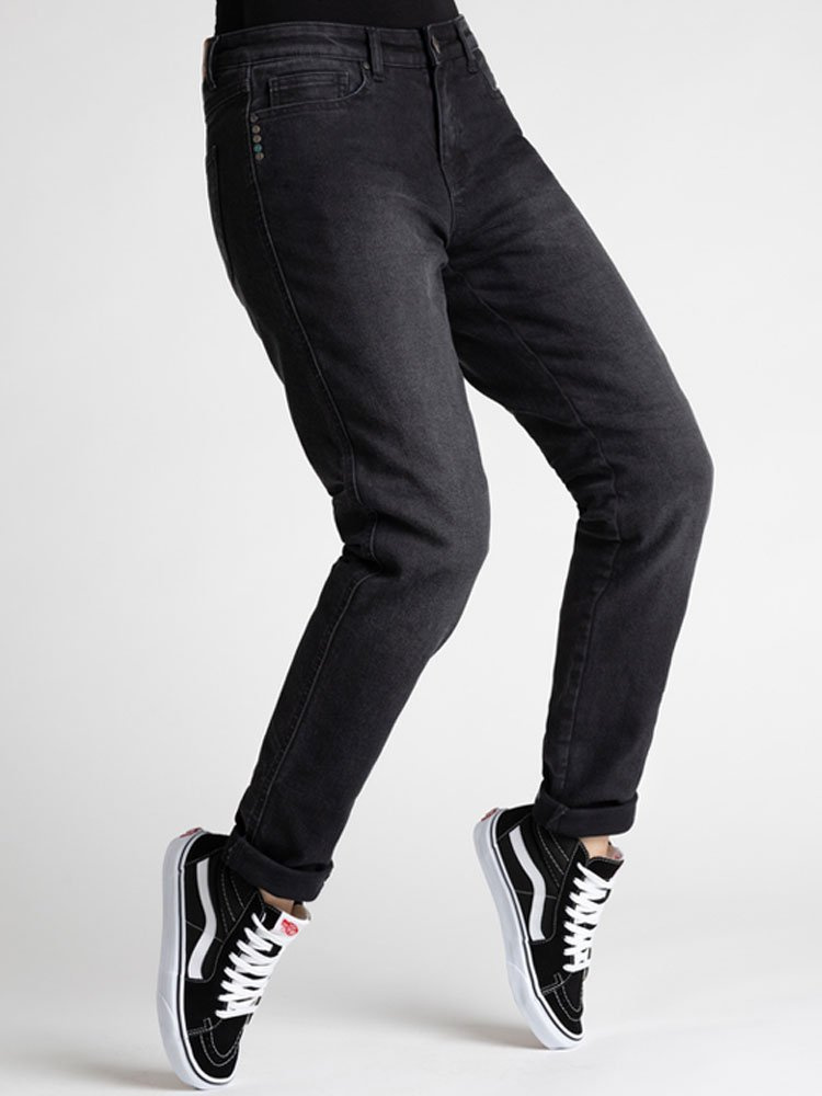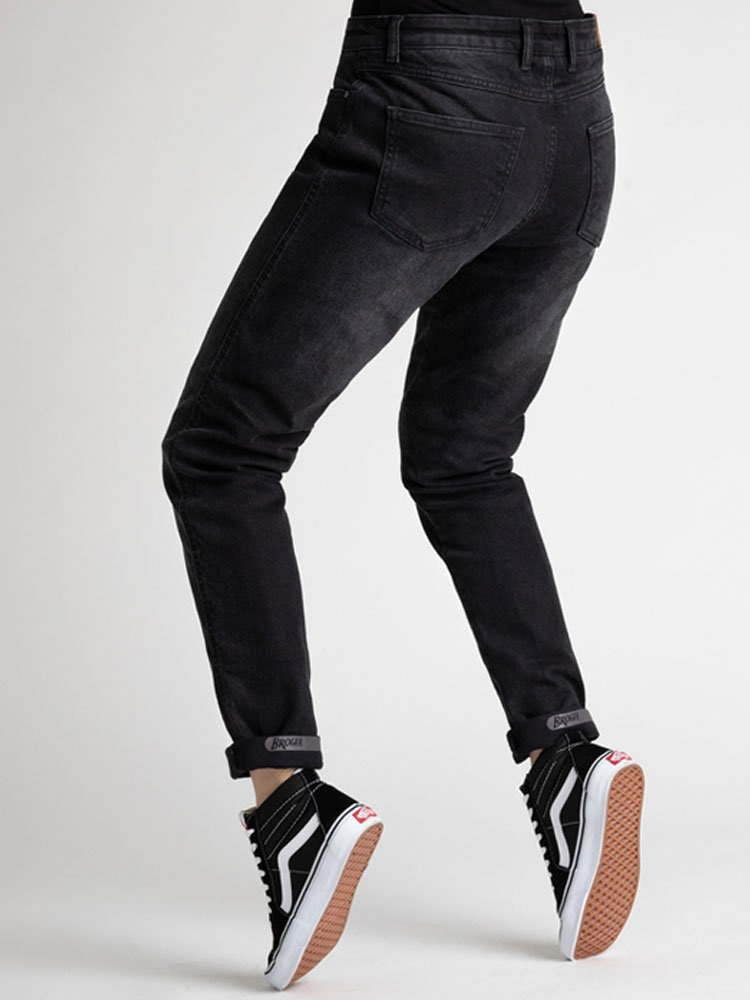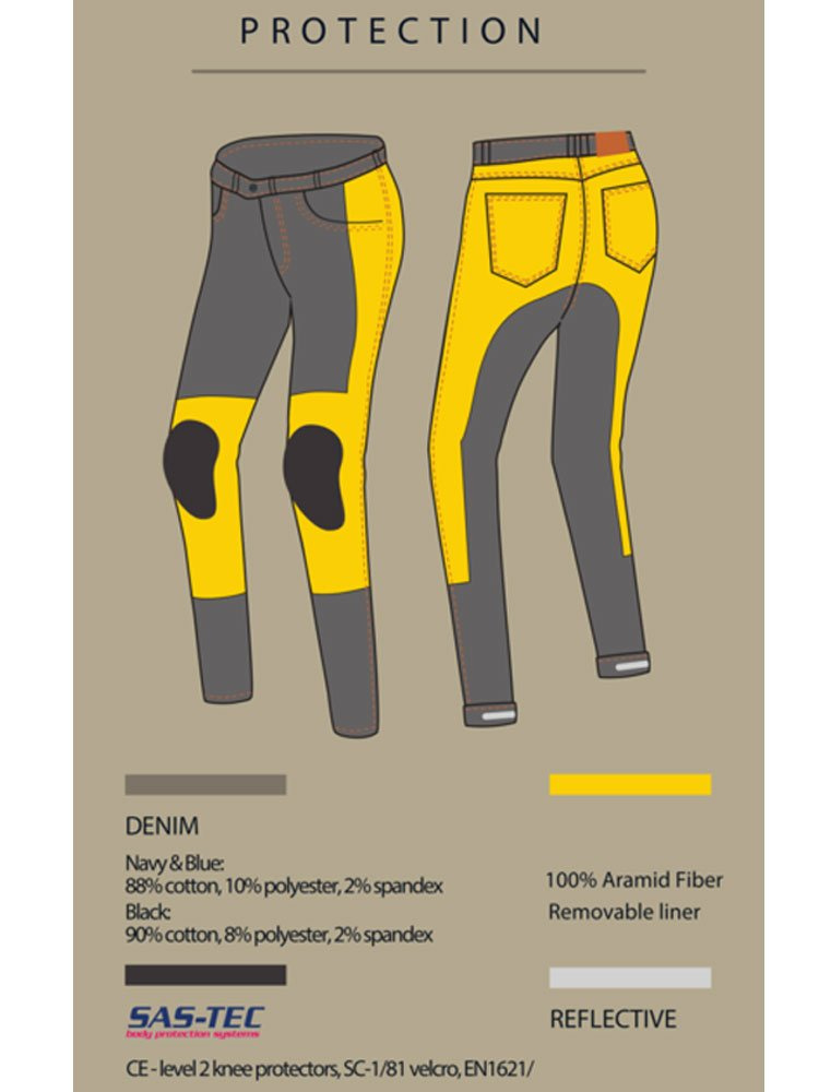 Broger California Lady to dopasowane do sylwetki jeansy ze zwężanymi nogawkami. Posiadają krój slim fit, a dzięki całkowicie wypinanej warstwie wewnętrznej z włókna aramidowego staną się zwykłymi, codziennymi jeansami. Spodnie zrobione są z tkaniny denim co zapewnia wygodę oraz bezpieczeństwo użytkowania. Aby zapewnić najwyższe możliwe bezpieczeństwo, ochraniacze w jeansach są stworzone z elastomerowej pianki SAS-TEC® świetnie absorbującej energię podczas uderzenia. Widoczność na drodze zapewniają odblaskowe elementy, które możemy ukryć lub zostawić widoczne podwijając nogawki.