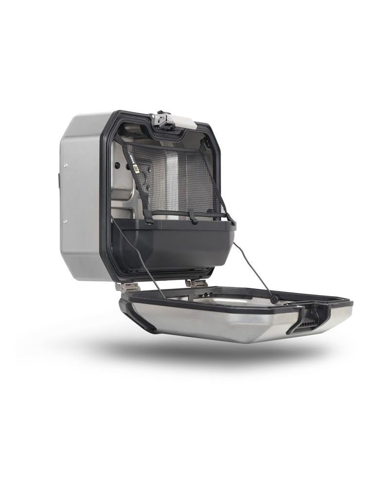 Kufer boczny TR47 wykonany z wytrzymałego aluminium o wygładzonym profilu i zintegrowanych elementach konstrukcyjnych. Wyposażony w całkowicie aluminiowy korpus z wytłoczonym logo oraz zewnętrzne zaczepy do dodatkowego zabezpieczenia. Kufer jest w pełni wodoodporny, dzięki podwójnej gumowej uszczelce krawędzi, uszczelnionej zintegrowanym uchwytem kompresyjnym.