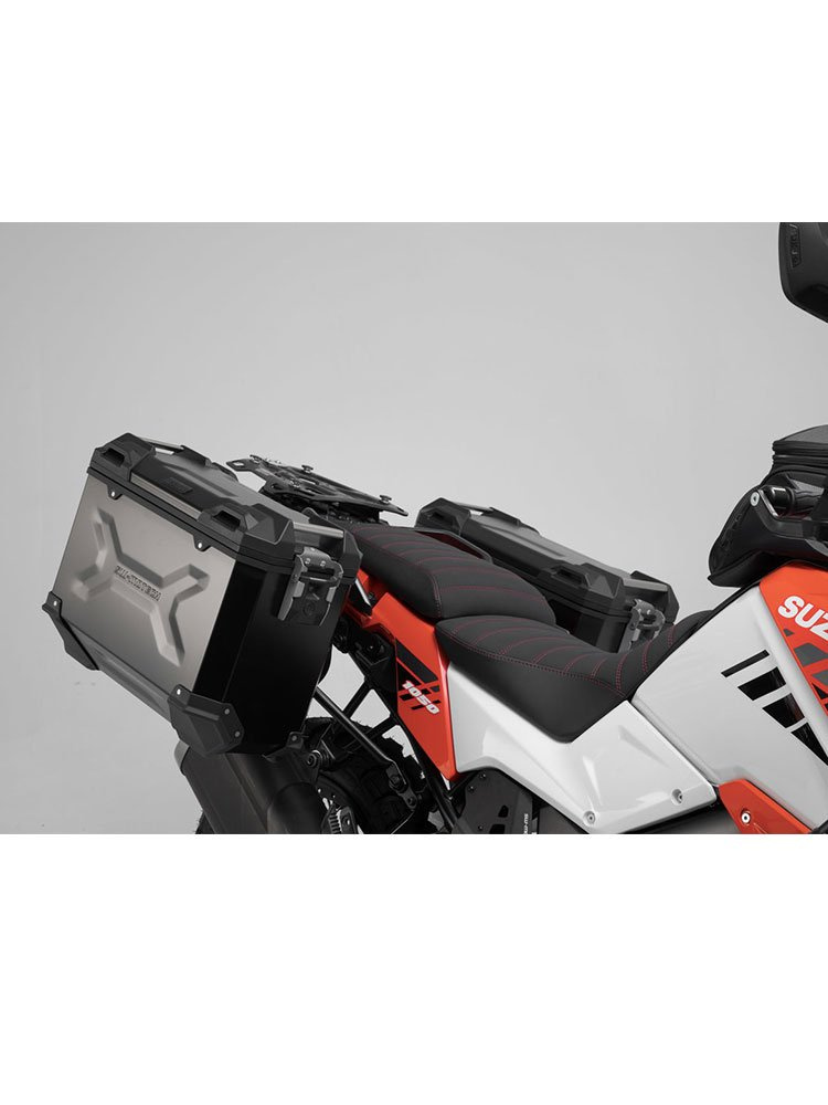 Zestaw Adventure Bagaż zawiera stelaż boczny PRO i pasujący stelaż centralny ADVENTURE-RACK. Stelaże są przymocowane do specyficznych dla motocykla punktów mocowania i zapewniają solidne wsparcie dla czarnych aluminiowych kufrów TRAX ADV. Solidne aluminiowe obudowy TRAX ADV przekonują swoją stabilnością, nieprzepuszczalnością wody i pyłu, elegancką optyką, przemyślanymi funkcjami i dużym wyborem akcesoriów