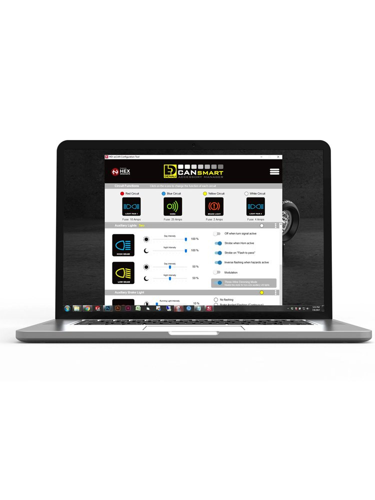 Cztery obwody CANsmart są wstępnie zaprogramowane do łączenia i niezależnego sterowania dwoma zestawami świateł DENALI, klaksonem SoundBomb i pomocniczym światłem hamowania B6.