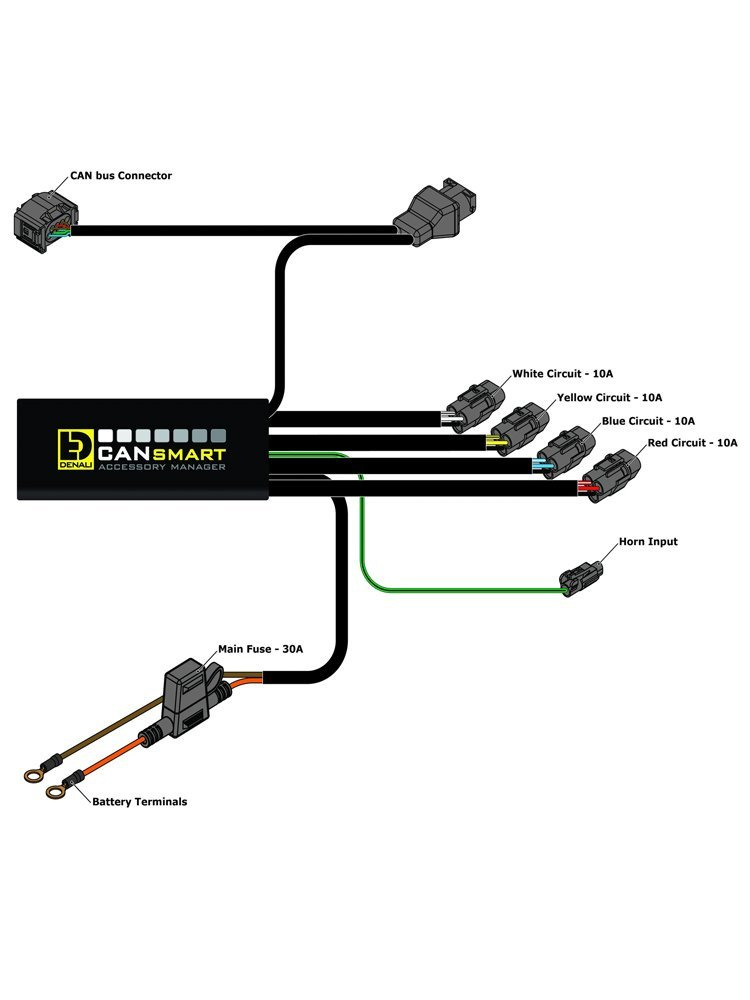 Cztery obwody CANsmart są wstępnie zaprogramowane do łączenia i niezależnego sterowania dwoma zestawami świateł DENALI, klaksonem SoundBomb i pomocniczym światłem hamowania B6.