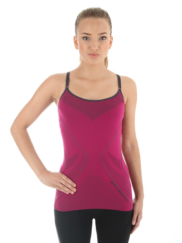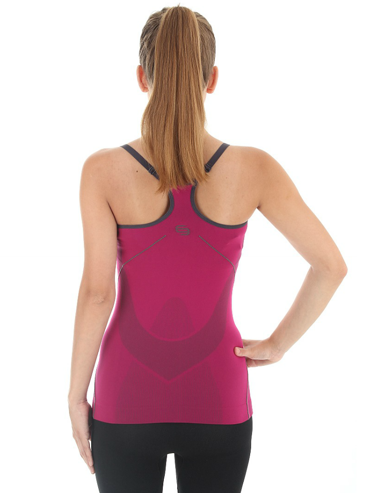 Koszulka damska na ramiączkach wykonana w technologii bezszwowej, z dwuwarstwowej, oddychającej dzianiny. Warstwa wewnętrzna odpowiada za szybkie odprowadzanie wilgoci na zewnątrz, dzięki czemu skóra pozostaje sucha, nawet podczas intensywnego wysiłku. Zastosowane w wyrobie włókno polipropylenowe charakteryzuje się najniższą absorpcją wilgoci, dzięki czemu dzianina bardzo szybko schnie. Specjalna struktura siatki w miejscach o wzmożonej potliwości (na klatce piersiowej, brzuchu i plecach) zwiększa efektywność transportu wilgoci. Ramiączka o regulowanej długości. Wewnętrzny top podtrzymuje biust podczas ćwiczeń. Strefy RIB wzdłuż linii talii zapewniają idealne dopasowanie do sylwetki i gwarantują swobodę ruchów. Sploty z pamięcią kształtu przeciwdziałają odkształcaniu. Koszulka do całorocznego użytku, polecana w szczególności do biegania oraz na zajęcia fitness i jogę.