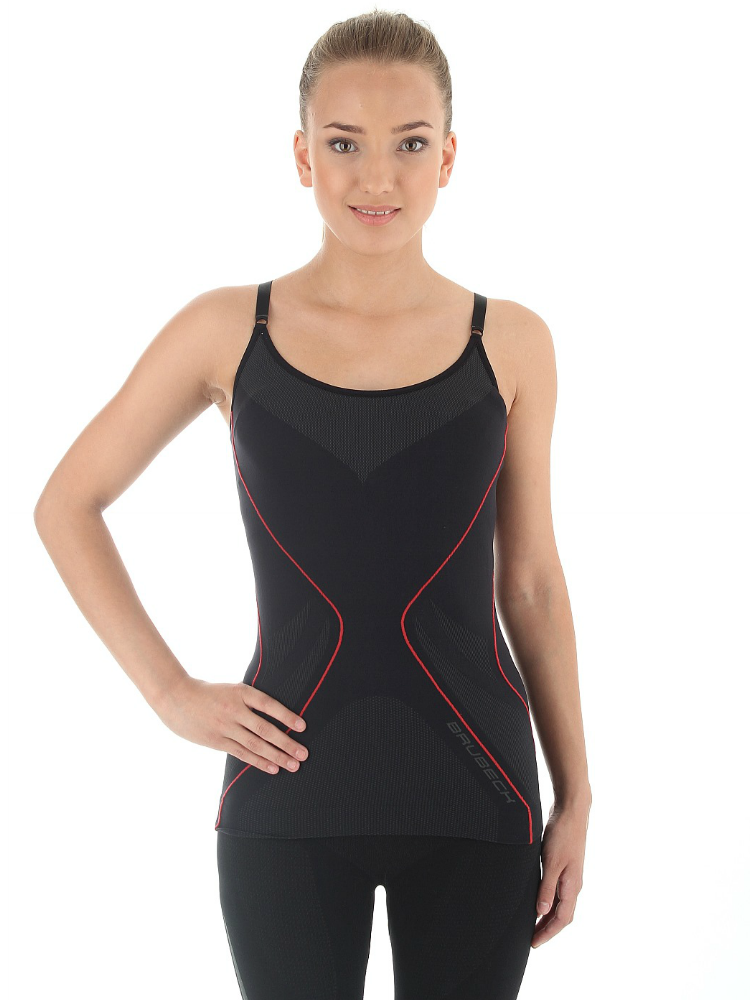 Koszulka damska na ramiączkach wykonana w technologii bezszwowej, z dwuwarstwowej, oddychającej dzianiny. Warstwa wewnętrzna odpowiada za szybkie odprowadzanie wilgoci na zewnątrz, dzięki czemu skóra pozostaje sucha, nawet podczas intensywnego wysiłku. Zastosowane w wyrobie włókno polipropylenowe charakteryzuje się najniższą absorpcją wilgoci, dzięki czemu dzianina bardzo szybko schnie. Specjalna struktura siatki w miejscach o wzmożonej potliwości (na klatce piersiowej, brzuchu i plecach) zwiększa efektywność transportu wilgoci. Ramiączka o regulowanej długości. Wewnętrzny top podtrzymuje biust podczas ćwiczeń. Strefy RIB wzdłuż linii talii zapewniają idealne dopasowanie do sylwetki i gwarantują swobodę ruchów. Sploty z pamięcią kształtu przeciwdziałają odkształcaniu. Koszulka do całorocznego użytku, polecana w szczególności do biegania oraz na zajęcia fitness i jogę.