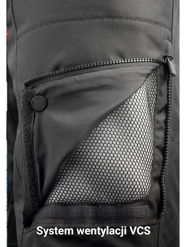 - zatrzaski regulacyjne na kołnierzu - ułatwiają dopasowanie obwodu kołnierza do indywidualnych preferencji motocyklisty oraz warunków pogodowych. Zimą szerszy obwód kołnierza pozwala na komfortowe połączenie kurtki z kominiarką lub kołnierzem, natomiast w okresie letnim zapewnia dodatkową wentylację