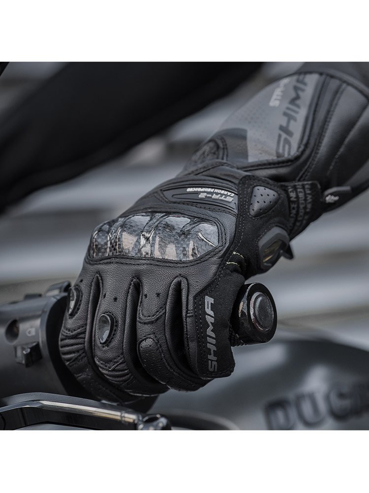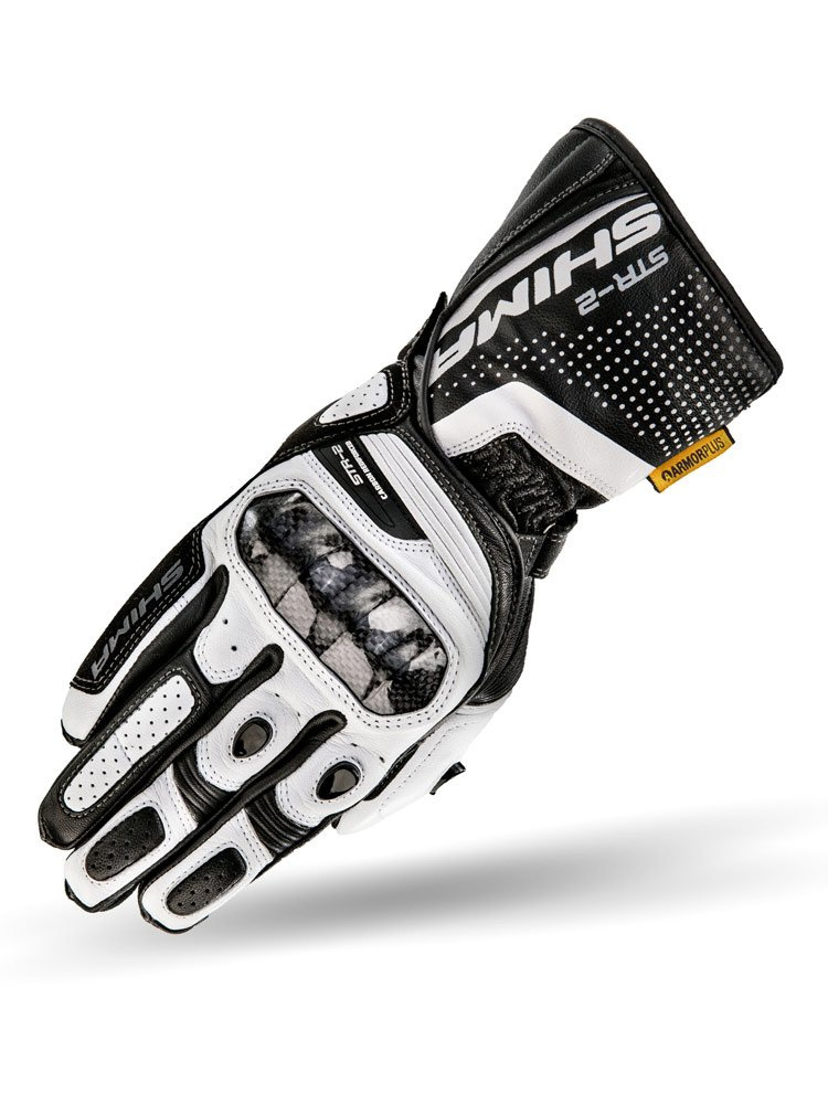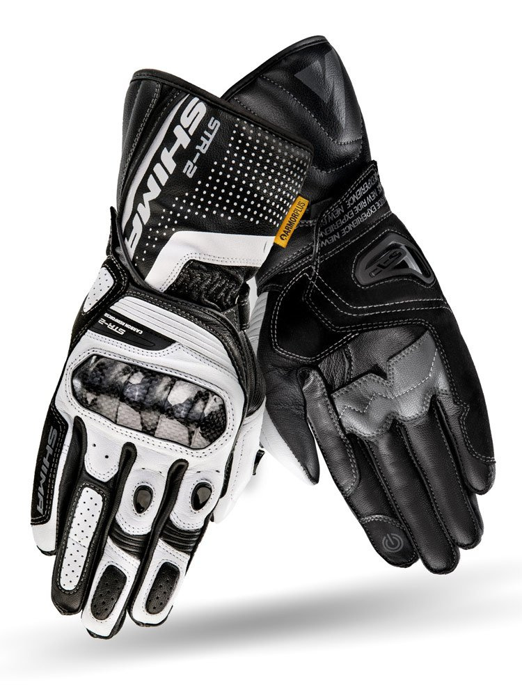 Shima STR-2 to motocyklowe rękawice o sportowo-miejskim charakterze. Wykonane są z odpornej na przetarcia i przebicia miękkiej, koziej skóry. Rękawica wyposażona została w konstrukcję z wstępnie zakrzywionymi palcami oraz licznie rozmieszczonymi elastycznymi panelami co pozwala na większą kontrole podczas jazdy. Za bezpieczeństwo odpowiadają protektory kostek wzmocnione dodatkowo włóknem węglowym oraz specjalne panele z absorbującej energię uderzenia pianki ArmorPlus umieszczone w najbardziej narażonych na urazy miejscach. Palce zabezpieczone zostały twardymi sliderami a wewnętrzną część dłoni chroni slider SAP i piankowy panel. Zewnętrzne szwy zabezpieczają materiał przed rozdarciem. Bezpieczne zapięcie typu V-Lock o ergonomicznym ustawieniu paska regulacji zapewnia komfort oraz zmniejsza ryzyko zsunięcia się rękawicy. Antypoślizgowa łata po wewnętrznej stronie zapobiega ześlizgnięciu się dłoni z manetki. Technologia Touch Tip na palcu wskazującym umożliwia swobodne obsługiwanie ekranów dotykowych.
