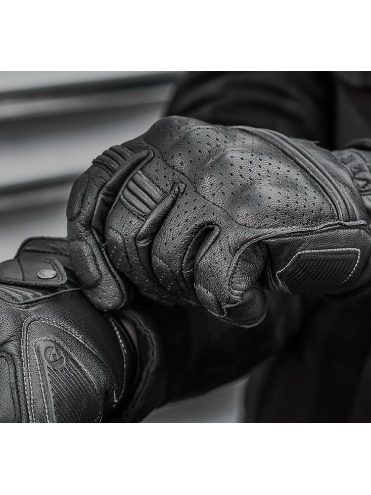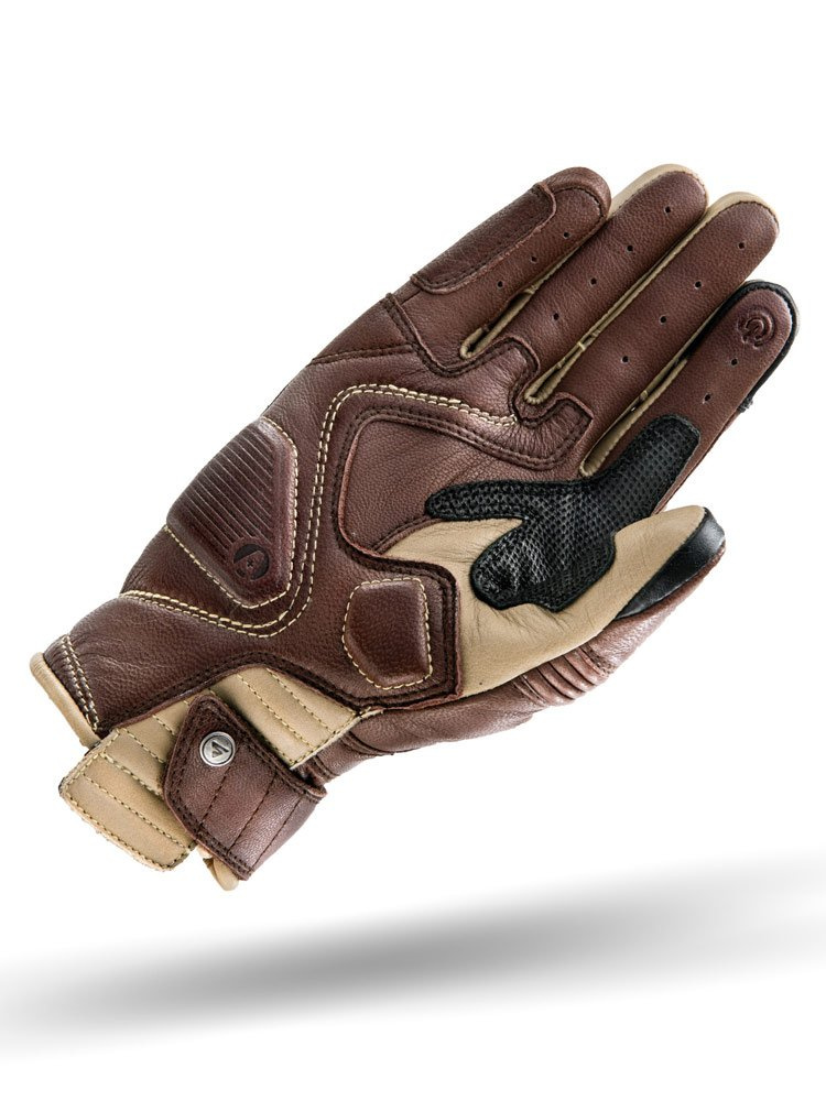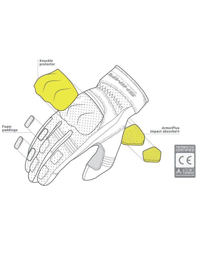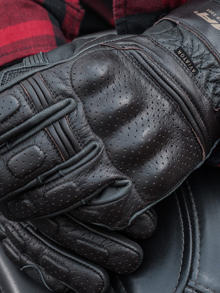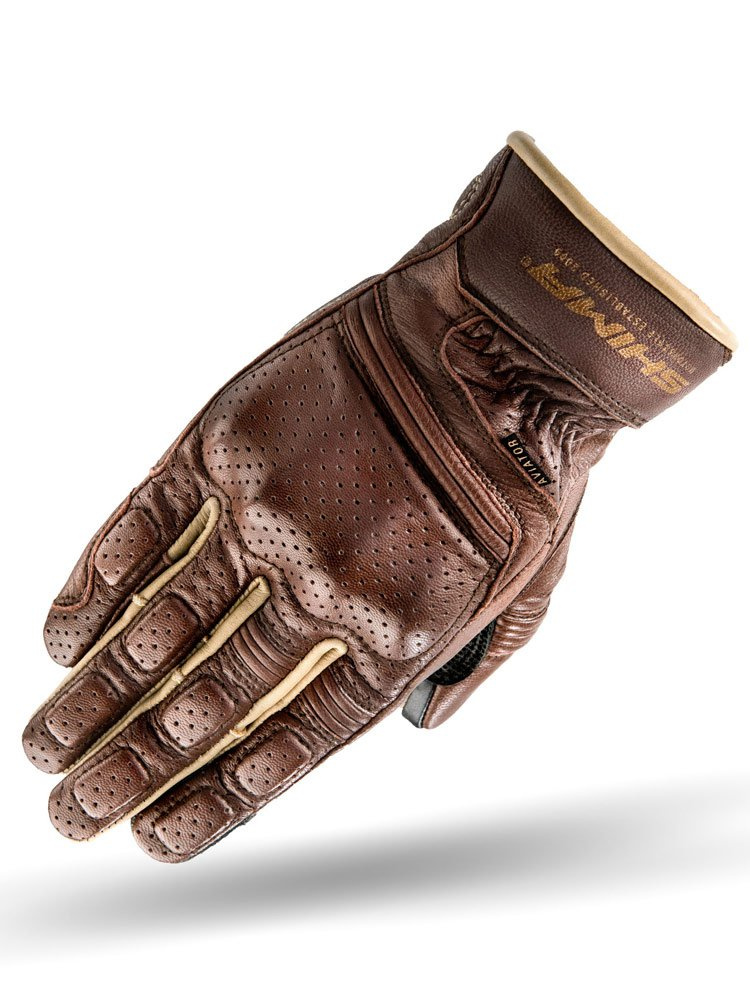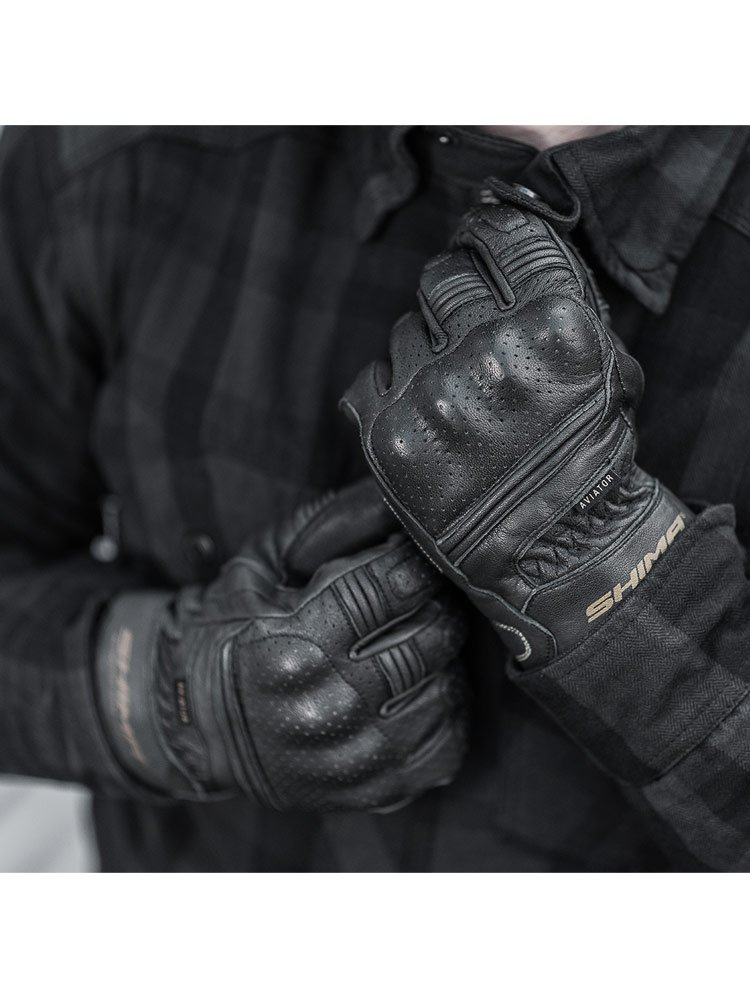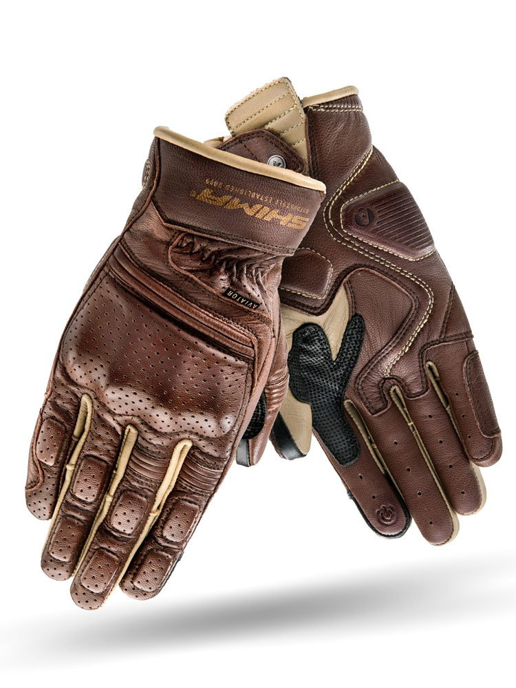 Shima Aviator to klasyczne rękawice przeznaczone do jazdy po mieście. Wykonane są z miękkiej, odpornej na przetarcia koziej skóry. Perforacja na zewnętrznej części dłoni zapewnia optymalną wymianę powietrza. Elastyczne panele na palcach i dłoni oraz wstępnie zakrzywione palce poprawiają mobilność i funkcjonalność. Za bezpieczeństwo odpowiadają twarde protektory kostek oraz miękkie absorbery z pianki ArmorPlus na palcach. Boki wzmocnione są dodatkową warstwą skóry. Łaty antypoślizgowe zwiększa precyzje w operowaniu manetką oraz zapobiega nagłemu ześlizgnięciu się dłoni. Zakładanie rękawicy ułatwia przymocowany do mankietu pasek zapewniający dodatkowy komfort. Zapięcie Micro-Velcro sztywno utrzymuje rękawice na dłoni. Technologia Touch Tip na palcu wskazującym umożliwia swobodną obsługę ekranów dotykowych.
