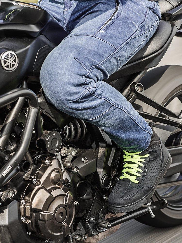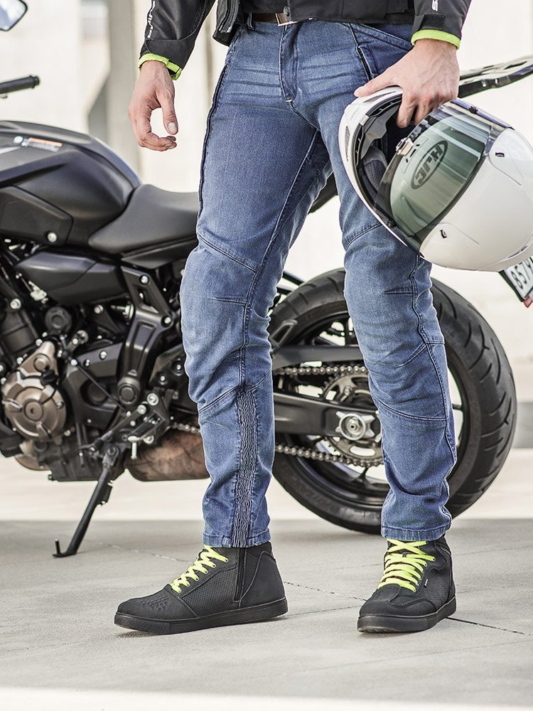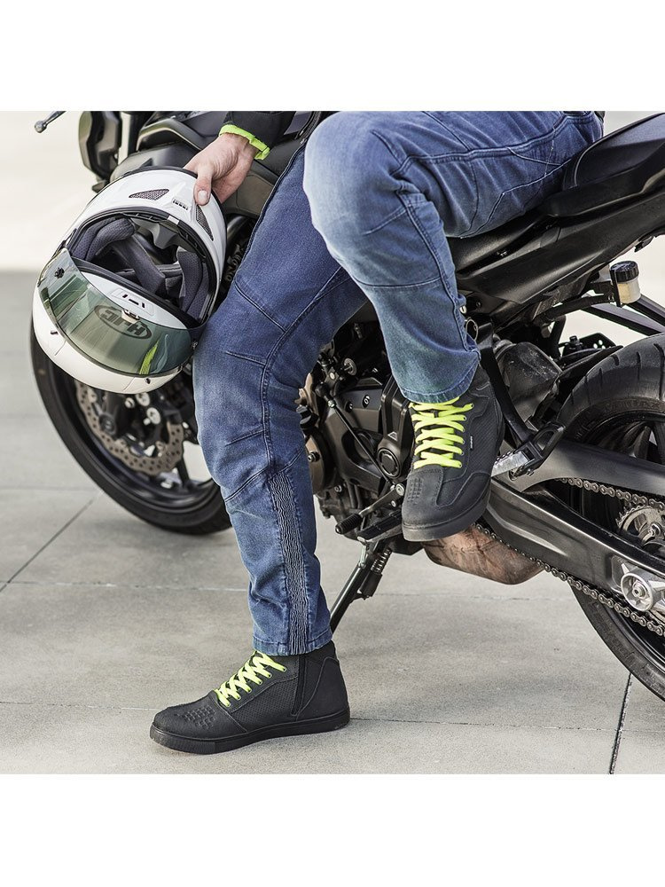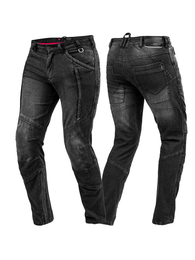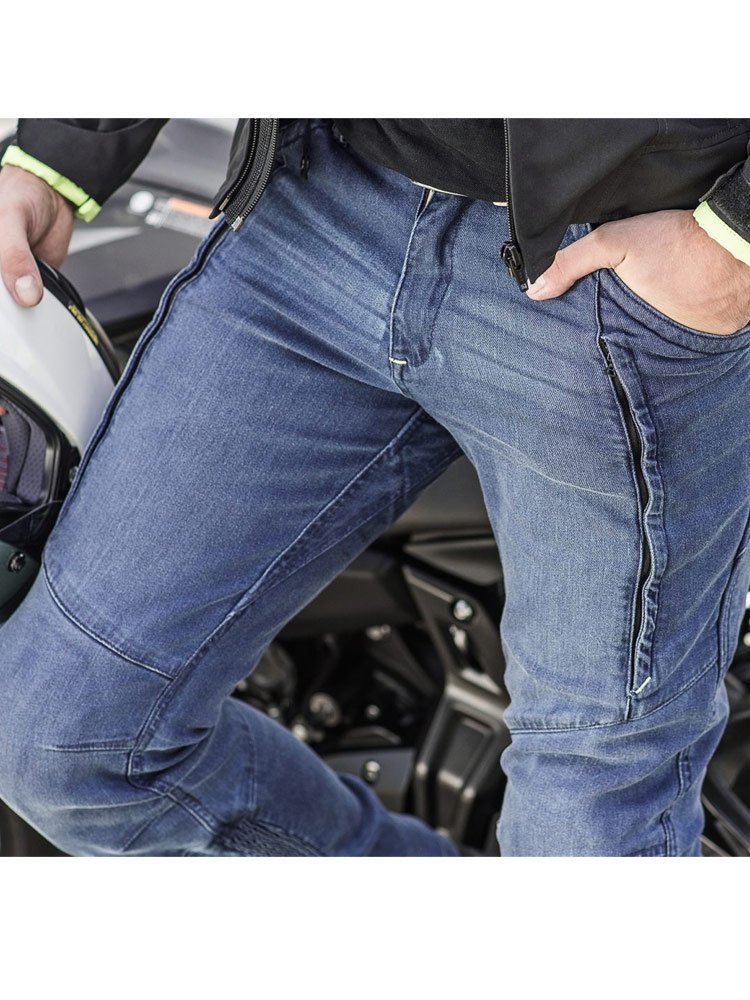 Jeansy Shima Ghost idealnie sprawdzą się podczas jazdy po mieście a ich elegancki wygląd sprawia że świetnie nadają się również jako casualowe spodnie na co dzień. Wykonane są z elastycznej tkaniny która zapewnia pełną swobodę ruchów preferując jednocześnie przyległe dopasowanie. Zewnętrzna strona nogawek zawiera harmonijkowe przeszycia dzięki czemu spodnie lepiej dopasowują się do łydki. Podczas jazdy na motocyklu dodatkowy komfort gwarantuje specjalna wstawka Comfort+ w kroczu dzięki której ruchy są w pełni swobodne. Za bezpieczeństwo odpowiada wewnętrzna warstwa aramidu w najbardziej narażonych na uderzenie miejscach takich jak biodra, kolana i pośladkach. Włókno to zapewnia odporność na wszelkiego rodzaju przetarcia oraz przebicia. Jeansy posiadają możliwość wyposażenia w opcjonalne protektory bioder i kości ogonowej. Ważnym elementem Ghost są panele wentylacyjne na zamek znajdujące się na udzie. Odblaskowe panele zwiększają widoczność motocyklisty podczas jazdy nocą lub w kiepskich warunkach pogodowych.