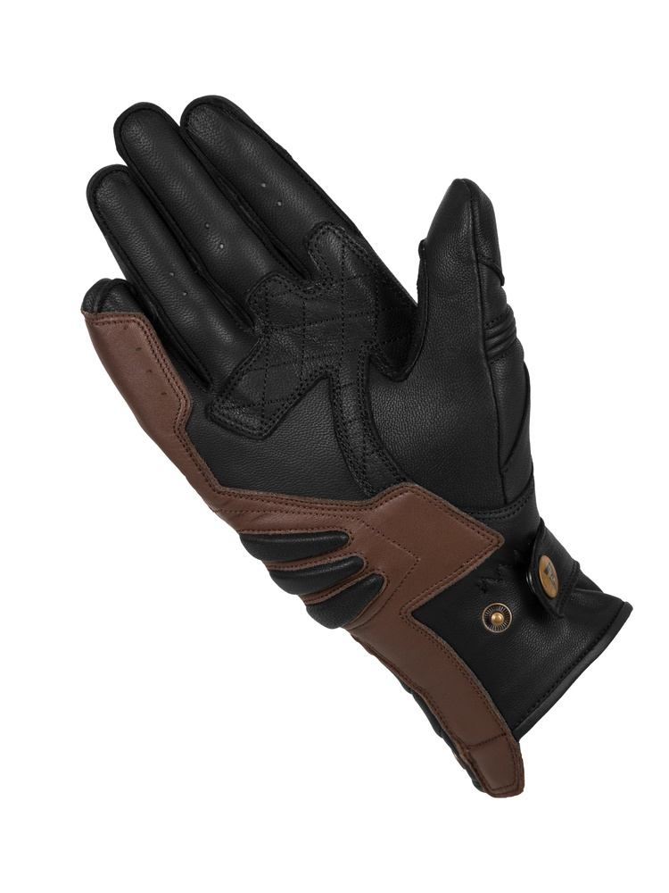 Klasyczne, skórzane rękawice motocyklowe Hunter mają wyprofilowaną konstrukcję, która zapewnia wygodne dopasowanie. Posiadają solidne, twarde ochraniacze kostek, które stanowią bardzo dobrą ochronę w razie upadku. Dodatkowo zastosowano panele z amortyzującej uderzenia pianki oraz podwójną warstwę skóry na dłoni i jej boku. W wielu miejscach rękawica zszyta jest dodatkowym szwem, który zabezpiecza ją przed niepożądanym rozpruciem. Pod względem konstrukcyjnym model ten wykonany jest z połączenia odpornych na uszkodzenia skór koziej i bydlęcej. Część chwytna posiada skórzany panel z przeszyciami zapewniający doskonałą przyczepność. Rozciągliwe panele na palcach oraz perforacja zwiększają komfort użytkowania rękawic. Oddychająca wyściółka wykonana jest z przyjemnego dla skóry materiału, który dba o suchy klimat dłoni. Wygodnym rozwiązaniem są zewnętrzne szwy na palcach, dzięki którym unikniesz odcisków i otarć po całodziennej jeździe motocyklem. Mankiet rękawicy jest średniej długości, posiada zamek ułatwiający ich zakładanie oraz zapięcie na pasek z zatrzaskiem. Przydatnym elementem może okazać się panel umożliwiający obsługę ekranów dotykowych bez ściągania rękawic.