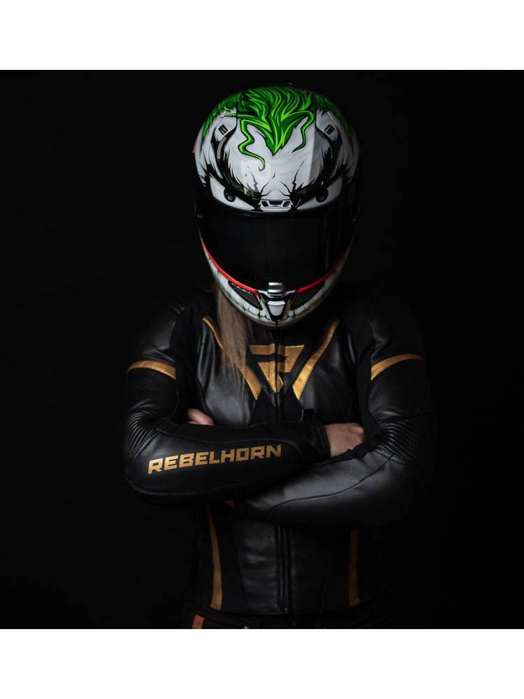 Dla miłośniczek sportowego stylu marka Rebelhorn zaprojektowała skórzaną kurtkę motocyklową damską Rebel. Oferuje wydajną wentylację w postaci licznej perforacji oraz swobodę ruchu, dzięki elastycznym wstawkom i rozciągliwym panelom. Skórzana konstrukcja sprawia, że kurtka jest odporna na przetarcia i ścieranie. Stanowi solidną, pierwszą warstwę ochronną. Dodatkowo w wielu miejscach producent zastosował podwójne i potrójne szwy. Miejsca najbardziej narażone na tarcie takie, jak łokcie i ramiona zabezpieczone są podszewką z włókna aramidowego, które wyróżnia się niebywałą wytrzymałością. W razie niefortunnego upadku ochronę gwarantują ochraniacze Sas-Tec na łokciach, ramionach oraz plecach. Podczas wieczornej jazdy będziesz doskonale widoczna na drodze dzięki odblaskom 3M Scotchlite. Skórzana kurtka idealnie przylega do ciała i aby zapewnić odpowiedni klimat wewnątrz niej, producent umieścił oddychającą podszewkę, która świetnie radzi sobie z wilgocią. Rękawy posiadają zamki, które ułatwiają zakładanie i ściąganie kurtki. Kołnierz oraz mankiety wykończone są przyjemnym materiałem, który nie podrażnia skóry. Przydatnym elementem kurtki jest długi zamek błyskawiczny, który pozwala na spięcie jej ze spodniami motocyklowymi Rebel.