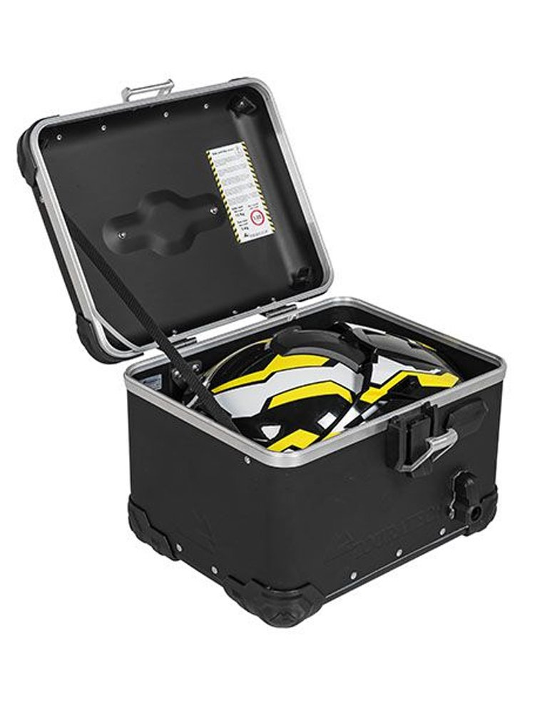 Całkowicie wodoodporny kufer centralny wykonany z wytrzymałego, polerowanego aluminium z narożnikami ochronnymi. Podstawowym elementem ZEGA jest nowo opracowany i zaprojektowany system mocowania na stelażach, który łączy w sobie łatwą obsługę z bezpiecznym mocowaniem. Twój kufer pozostaje bezpiecznie przymocowany do motocykla, nawet jeśli działają na niego bardzo duże siły. Montaż jest bardzo prosty, mechanizm blokujący jest wyposażony w blokadę bezpieczeństwa, która jest aktywna nawet jeśli jej nie blokujesz, a obsługa jest łatwa nawet w najgrubszych rękawicach. Wystarczy wsunąć haczyki na zębatkę i nacisnąć dźwignię napinającą w dół, aż wskoczy na swoje miejsce. Kufer na stelażu może być dodatkowo zabezpieczony przed kradzieżą za pomocą zamka (sprzedawanego osobno). Aby zdemontować kufer, po prostu pociągnij za dźwignię i zdejmij kufer ze stelaża. Mechanizm sprawdza się również w wymagających warunkach - brud, piasek, błoto itp. Na pokrywie znajdują się cztery górne szlufki do mocowania dodatkowego miękkiego bagażu. Nowo opracowany system wentylacji zmniejsza ciśnienie w sakwie lub na sakwie w przypadku zmiany wysokości.
