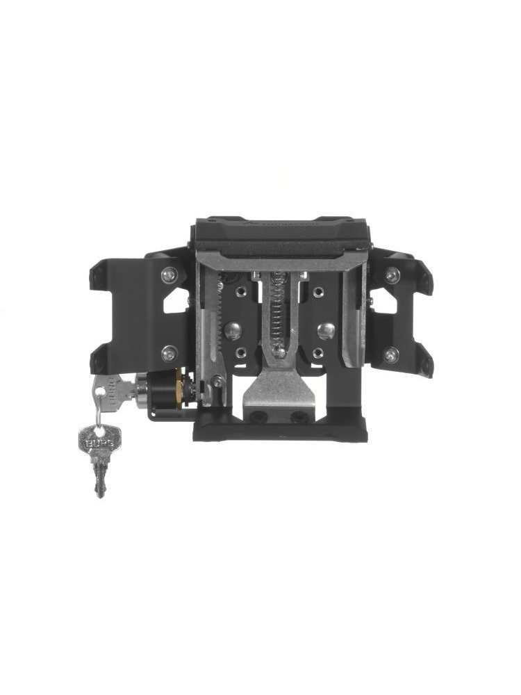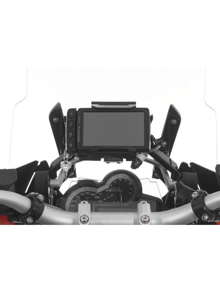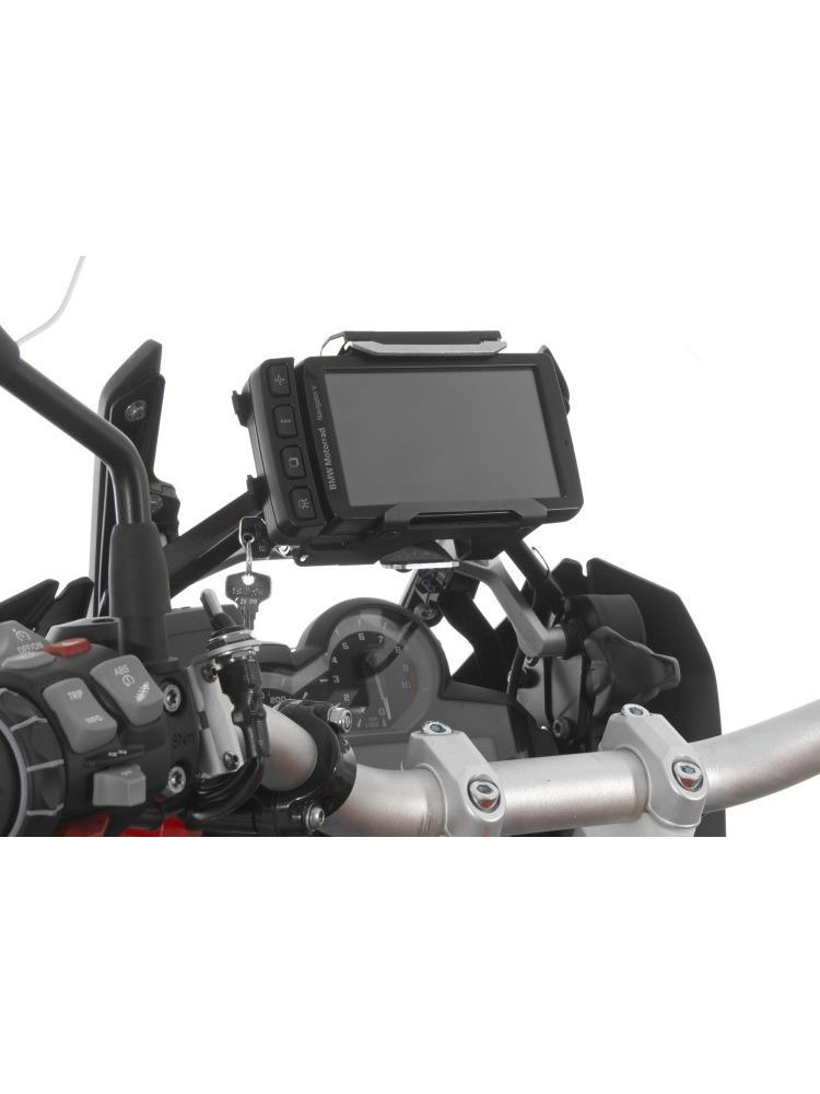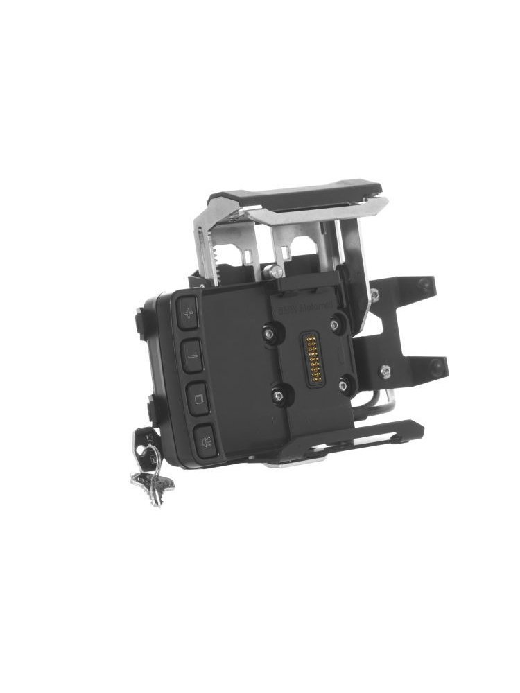 Uchwyt bazowy z listwą zasilającą i przyciskami sterującymi z boku, który jest dostarczany z BMW Navigator, jest zintegrowany z uchwytem kierownicy Touratech.