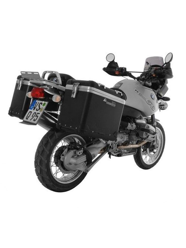 Zestaw: kufry boczne z anodowanego aluminium czarne Zega Pro + stelaże srebrne Touratech BMW R1150GS/R1150GS Adventure/R1100GS/R850GS (38+45L)