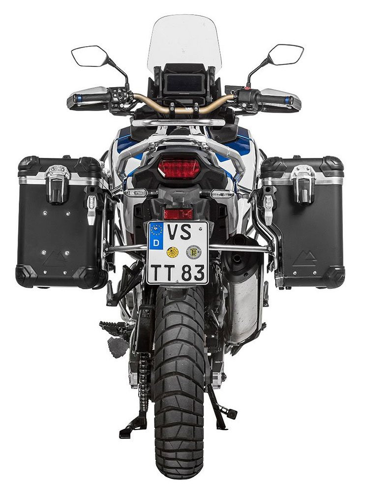 Zestaw: kufry boczne z anodowanego aluminium czarne Zega Evo X + stelaże srebne Touratech Honda CRF1100L Africa Twin (22-)/ Adventure Sports (2 x 38L)