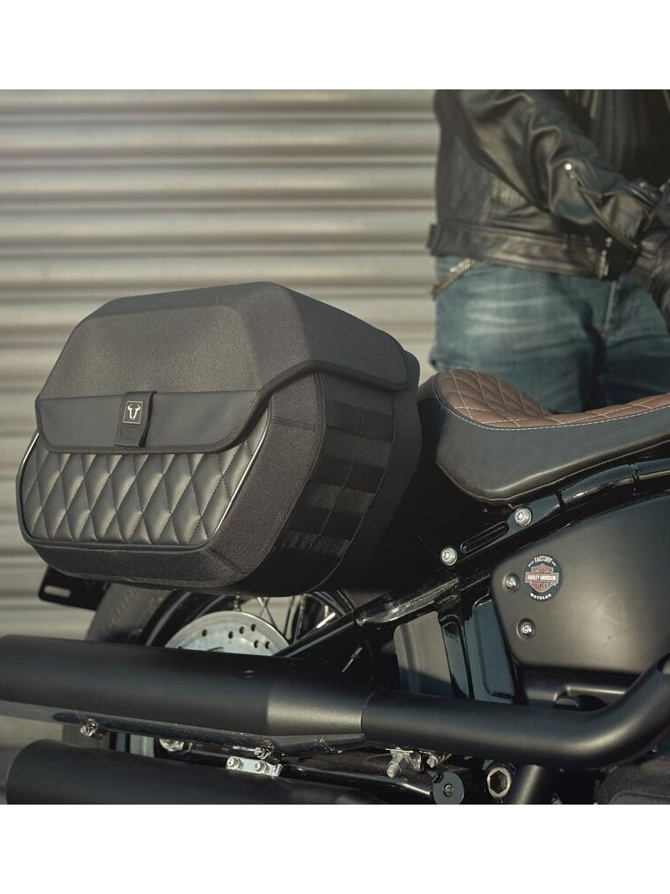 Torba boczna LH łączy niską wagę sakwy z wysoką stabilnością kształtu kufra. To nowe spojrzenie na stylistykę Legend Gear połączono z najnowocześniejszymi materiałami i nowoczesnym systemem mocowania. Torbę można zamontować na stelażu jednym ruchem ręki za pomocą zintegrowanego mechanizmu blokującego.Materiał zewnętrzny łączy tkaninę i ziarnistą imitację skóry z wyszukanym pikowaniem w romby. Sakwa boczna posiada zintegrowany uchwyt do przenoszenia dla jeszcze większej wygody. Posiada również system MOLLE do mocowania toreb na akcesoria. Złodzieje i deszcz nie mają szans: zintegrowana ochrona przed kradzieżą, zamykana pokrywa i wodoodporna torba wewnętrzna w zestawie chronią Twój bagaż. Pokrywa i tylny panel wykonane ze stabilnego wymiarowo i nadal lekkiego tworzywa ABS oraz wzmocnionych polietylenem boków zapewniają, że torba zachowuje swój kształt nawet przy większych prędkościach.
