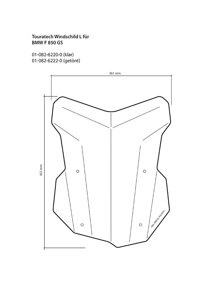- W połączeniu z oryginalnym uchwytem do szyby BMW (46-63-8-564-649) lub regulatorem szyby BMW (46-63-8-562-228) pasuje do motocykla BMW F750GS