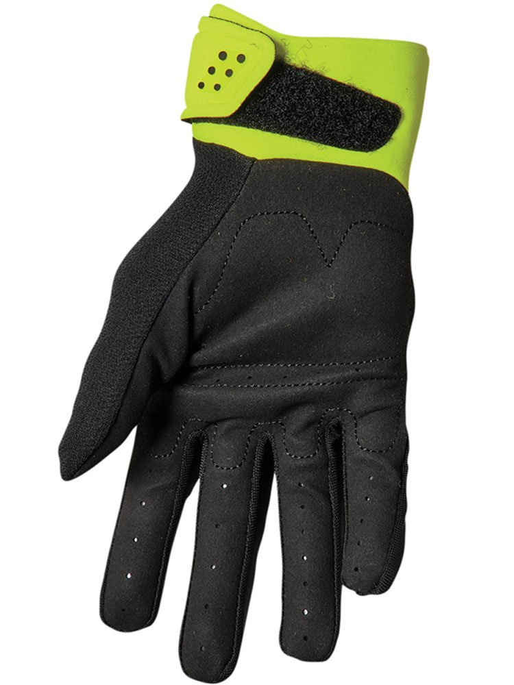Thor Spectrum to rękawice cross, dedykowane do jazdy motocyklem w letniej porze roku. Zostały wykonane z mieszanki materiałów, w postaci przewiewnej, a zarazem oddychającej siateczki mesh oraz innowacyjnego materiału Airprene. Takie połączenie sprawia, że rękawice cross Spectrum zapewniają komfort termiczny w cieplejsze dni. W tym miejscu warto również o perforowanym palcach od spodu, które usprawniają cały proces cyrkulacji powietrza. Dłoń rękawicy jest wyściełana, co przekłada się na lepsze czucie manetek naszego motocykla. Na kostkach i palcach zastosowano gumowe ochraniacze ze sztucznego tworzywa TPR, zabezpieczające rękę użytkownika przy bezpośrednim kontakcie z asfaltem podczas ewentualnego upadku. W celu zwiększenia wytrzymałości całej konstrukcji, rękawice Spectrum wzbogacono o dodatkowe wzmocnienia, które znajdziemy na kciuku oraz w punktach chwytu. Za sprawą technologii TouchScreen możemy korzystać z urządzeń wyposażonych w ekran dotykowy bez konieczności zdejmowania rękawicy. Na nadgarstku umieszczono wygodne w użyciu zapięcie na rzep, gwarantujące optymalne dopasowanie rękawicy do preferencji użytkownika. Rękawice cross Thor Spectrum dostępne są w kilku wariantach kolorystycznych.