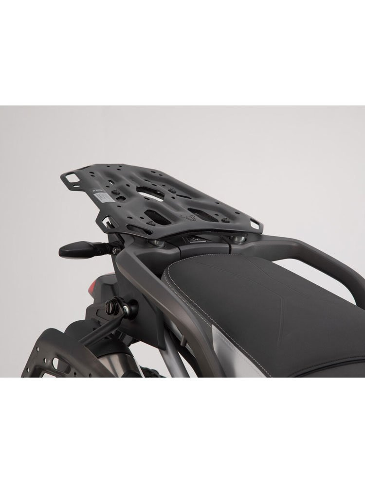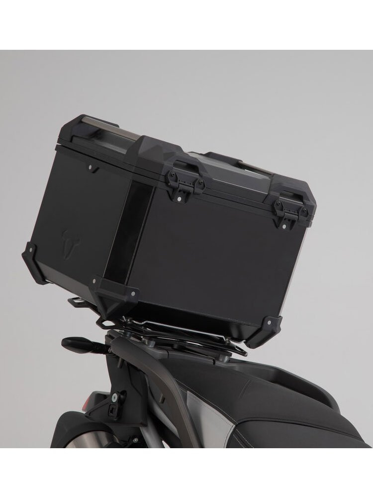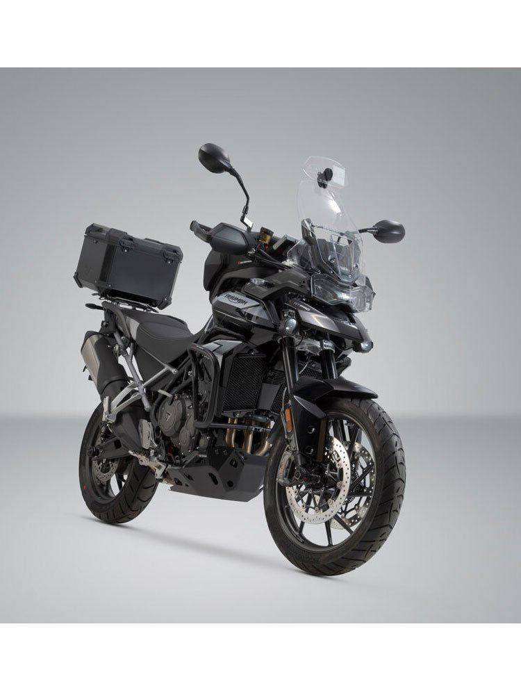 Zestaw: kufer centralny czarny TRAX ADV + stelaż Adventure-rack SW-Motech Triumph Tiger 900/ GT/ Rally/ Pro (19-) / 1200 GT Explorer / Rally Pro (22-), Tiger 850 Sport (21-) [pojemność: 38 L]