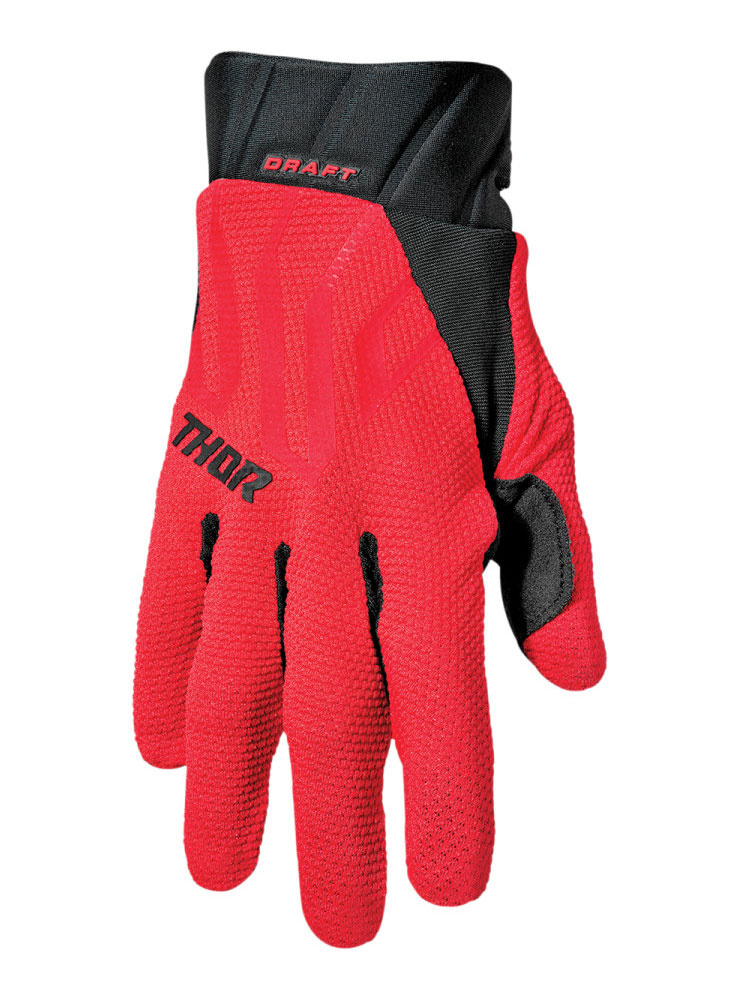 Rękawice cross Thor Draft zapewniają idealne dopasowanie i wyczucie kierownicy. Oddychająca i rozciągliwa w czterech kierunkach tkanina mesh gwarantuje świetną wentylację oraz pełną swobodę ruchu. Jednowarstwowa dłoń z zamszu AX Suede® pozwala na doskonałe wyczucie osprzętu motocykla. Dodatkowo posiada ona perforację, która zwiększa przepływ powietrza. Dla lepszej kontroli dźwigni końcówki palców pokryto silikonem. Rękawice posiadają formowany mankiet z biopianki, który zapewnia lekkość i bezpieczne dopasowanie. Ząbkowany otwór na nadgarstek zapewnia łatwy dostęp, a zapięcie na rzep solidnie utrzymuje rękawice na dłoni.