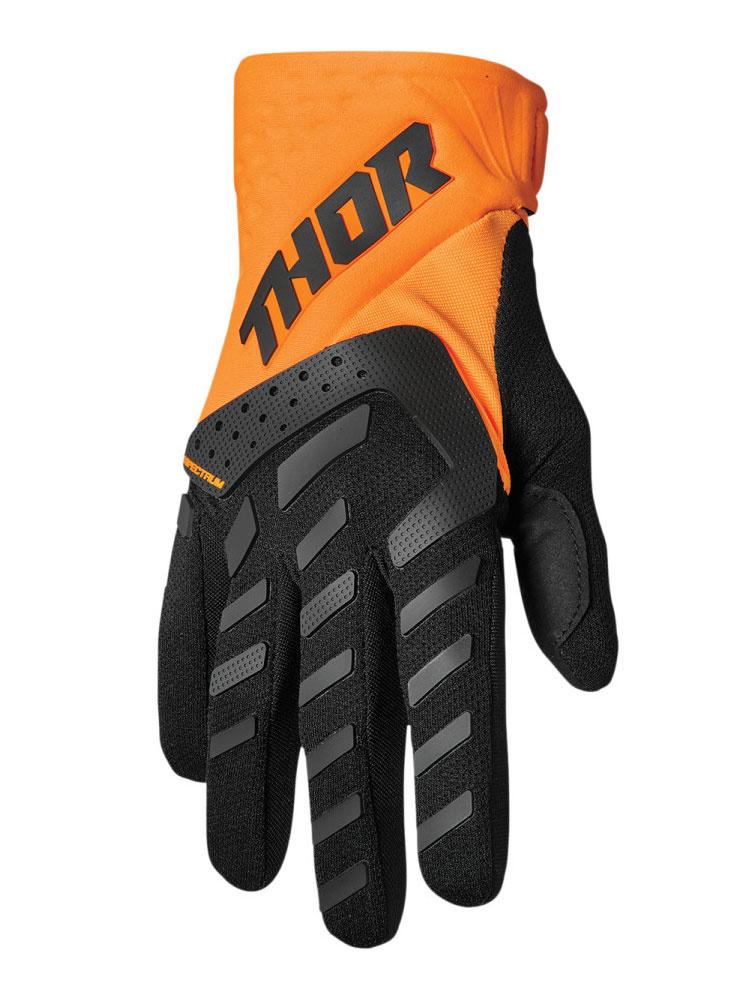 Rękawice cross dziecięce Thor Spectrum oferują maksymalny komfort podczas off-roadowej jazdy. Połączenie elastycznych i oddychających materiałów z gumowymi ochraniaczami TPR na kostkach i palcach pozwoliło uzyskać produkt, który umożliwia sprawne operowanie kierownicą i manetkami oraz bardzo dobrą ochronę dłoni przed przetarciami i stłuczeniami. Dużym atutem rękawic są formowane wkładki piankowe, które poprawiają komfort i bezpieczeństwo jazdy oraz perforowana dłoń zwiększająca przepływ powietrza. Dodatkowe wzmocnienia na kciuku i w punktach chwytu przedłuża żywotność i trwałość rękawic. Lekka wyściółka dłoni gwarantuje pewny i wygodny chwyt. Rękawice posiadają krótki mankiet z solidnym zapięciem na rzep. Praktycznym elementem rękawic są specjalne panele na palcach umożliwiające obsługę ekranów dotykowych w rękawicach.