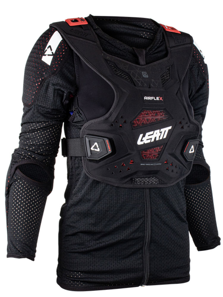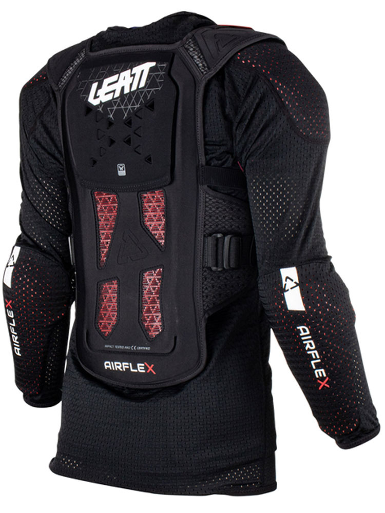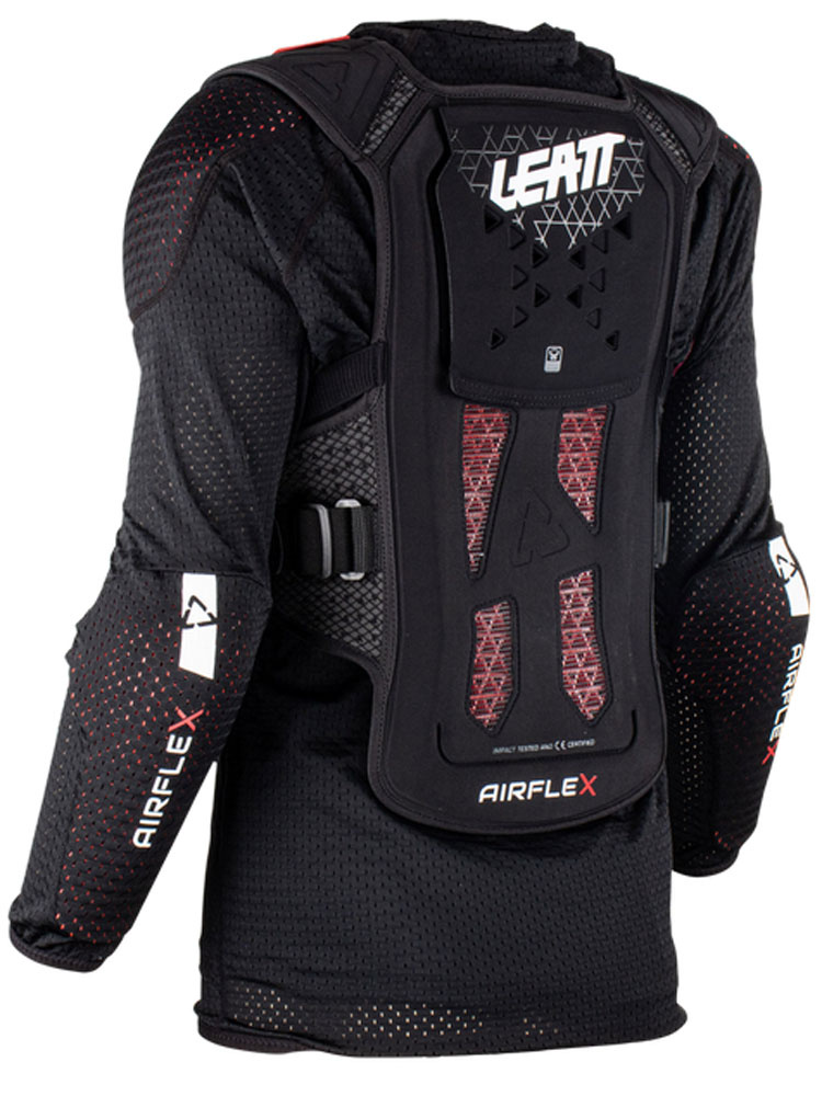 Leatt Airflex to zbroja motocyklowa zapewniająca innowacyjną ochronę całej górnej części ciała. Główna część wykonana jest z modułowego, kompresyjnego materiału który świetnie dopasowuje się do kształtu ciała oraz umożliwia proste zakładanie i zdejmowanie zbroi dzięki zamkowi błyskawicznemu. Ochrona łokci i ramion poziomu 1 wbudowana jest w tkaninę. Wentylowany protektor klatki piersiowej I-Mesh oraz protektor pleców umożliwiają ich regulacje za pomocą pasków, dzięki czemu można dostosować je do własnych potrzeb. Za optymalny przepływ powietrza i odprowadzanie wilgoci odpowiadają tkaniny MoistureCool i Airmesh gwarantujące przyjemny chłód oraz komfort podczas jazdy. Airflex kompatybilna jest z protektorami szyi BraceOn. Całość nadaje się do prania ręcznego.