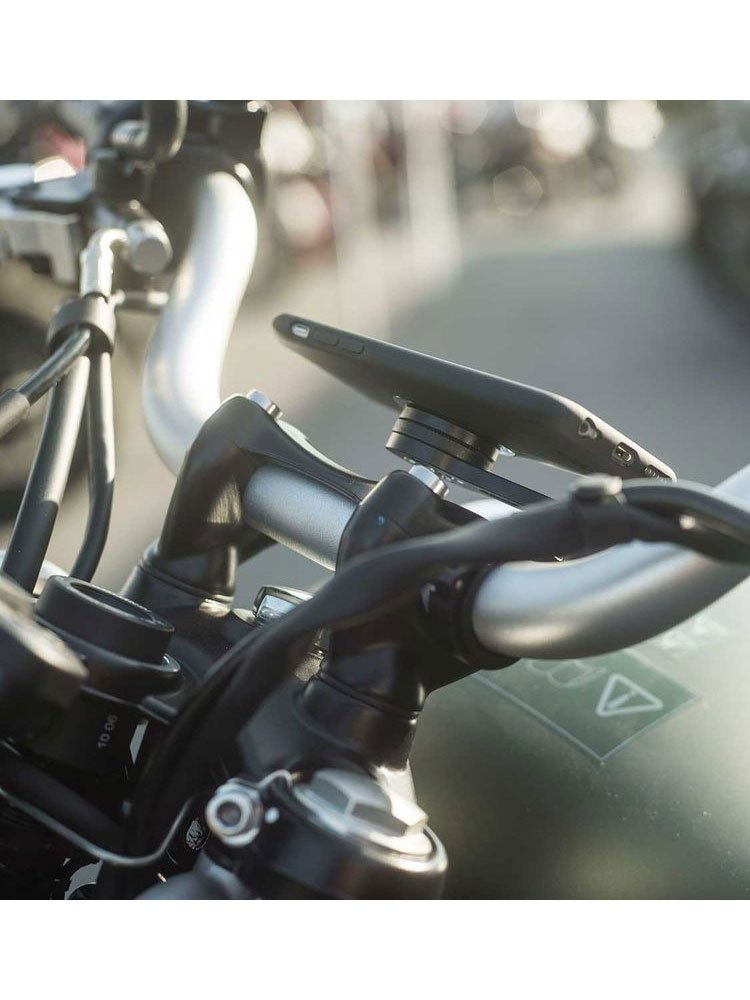 Przymocuj MOTO MOUNT PRO do kierownicy swojego motocykla, a będziesz gotowy do zamontowania pokrowca SP Connect ™  umieszczając go na uchwycie i obracając o 90 ° w kierunku zgodnym z ruchem wskazówek zegara. Aby dodatkowo zabezpieczyć smartfon, uchwyt ma również unikalny system tłumienia wibracji, który zmniejsza siły G nawet o 40% (w zależności od modelu motocykla i telefonu).