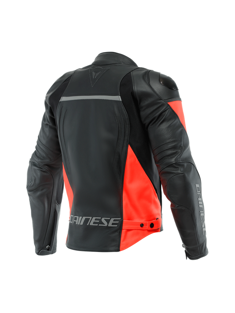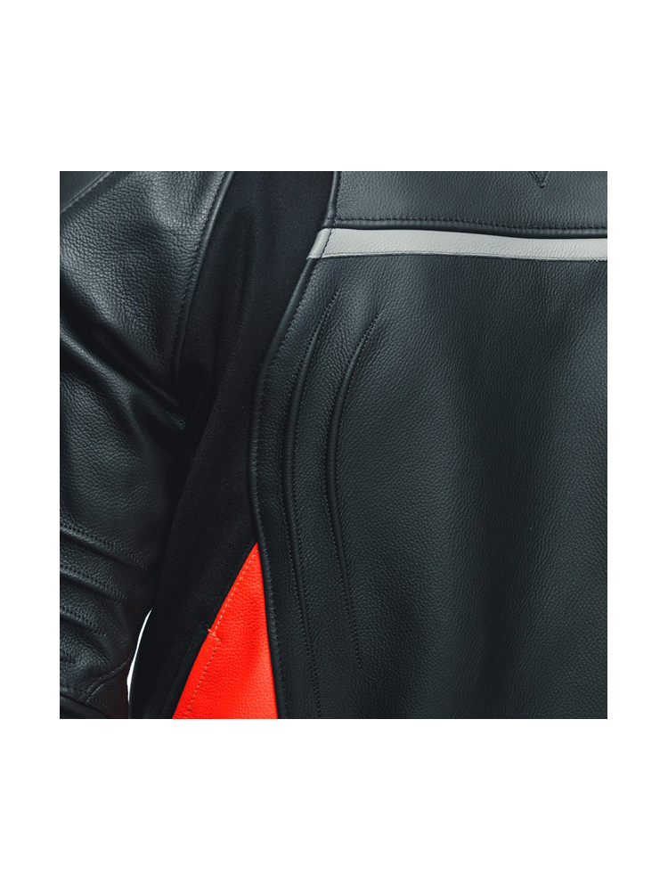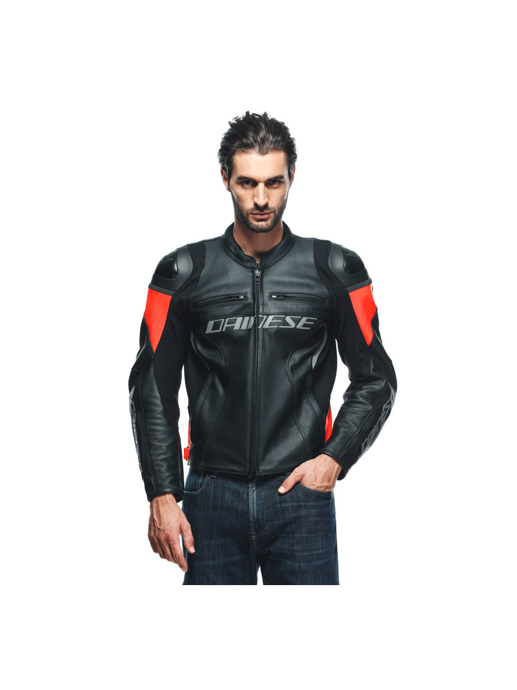 Kurtka Dainese Racing 4 to sportowa kurtka motocyklowa, gwarantująca bezpieczeństwo i komfort użytkowania na najwyższym poziomie. Wyróżnia się wytrzymałością, dzięki zastosowaniu odpornego na przetarcia i rozdarcia materiału w postaci skóry bydlęcej oraz odpornej na wszelkiego rodzaju plamy oleju i wodę tkaniny S1. Kurtka Racing 4 oferuje znakomitą ochronę podczas motocyklowej podróży na którą składają się certyfikowane ochraniacze ramion i łokci, zapewniające dobrą widoczność w każdych warunkach pogodowych wstawki odblaskowe oraz opracowane przez firmę Dainese aluminiowe osłony na ramionach. Istnieje również możliwość montażu opcjonalnego protektora pleców G1 i G2. O swobodę ruchów zadbają wstawki z materiału Microelastic 2.0, natomiast regulacja w pasie gwarantuje idealne dopasowanie. Mocną stroną modelu Racing 4 jest perfekcyjna cyrkulacja powietrza, dzięki zastosowaniu otworów wentylacyjnych na klatce piersiowej i w bocznej strefie oraz wyściółce Nanofeel, posiadającej właściwości antybakteryjne. Kurtkę bez problemu możemy spiąć z dedykowanym modelem spodni motocyklowych za sprawą specjalnego zamka błyskawicznego. Cztery kieszenie pozwolą na bezpieczny transport drobnych, podręcznych rzeczy.