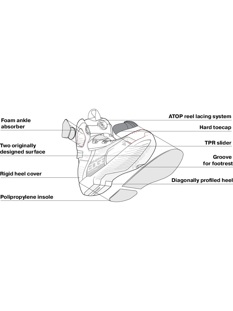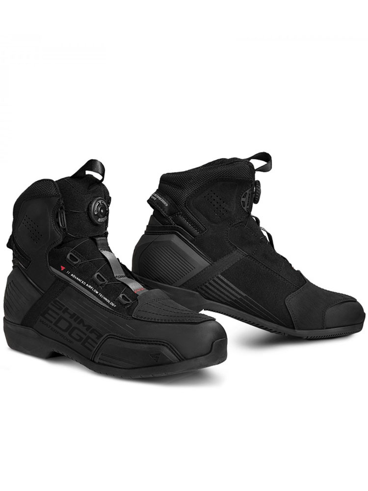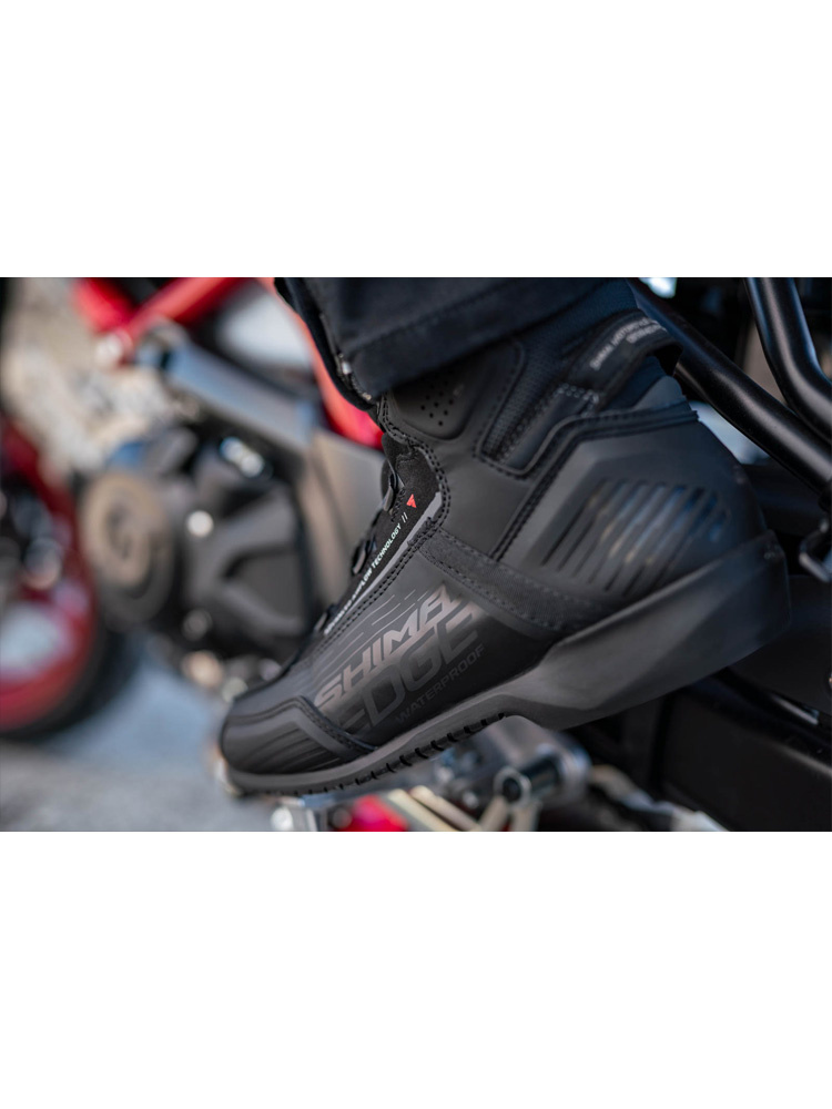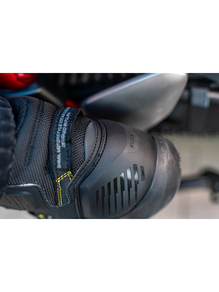 Edge WP to buty motocyklowe, dedykowane do podróży na miasto. Opracowane przez polską markę Shima buty, za sprawą oddychającej membrany NextDry, są w pełni wodoodporne, dzięki czemu mogą być użytkowane podczas intensywnych opadów deszczu. Obuwie jest miejscowo perforowane i w połączeniu z przewiewną konstrukcją języka, zapewnia optymalną cyrkulację powietrza na całej powierzchni. Na kostkach umieszczono wykonane z termoplastycznej gumy protektory Sap. Dodatkowo buty motocyklowe Shima Edge WP, zaopatrzono w liczne wzmocnienia, które znajdziemy na piętach oraz palcach. Pozostając przy temacie bezpieczeństwa należy wspomnieć o odblaskowych elementach, które w znacznym stopniu poprawiają widoczność użytkownika po zmroku oraz w trudnych warunkach. Podeszwa butów została wykonana z wykorzystaniem technologii ESG. Specjalnie ukształtowana powierzchnia podeszwy, zapewnia doskonały poziom przyczepności. Buty motocyklowe Edge WP wzbogacono o specjalny klin, który ułatwia utrzymanie stopy na podnóżku. System sznurowania Atom jest prosty w obsłudze i umożliwia wiązanie obuwia przy użyciu tylko jednej ręki. Oprócz tego obuwie wyposażono w pasek ułatwiający zakładanie buta na stopę motocyklisty.