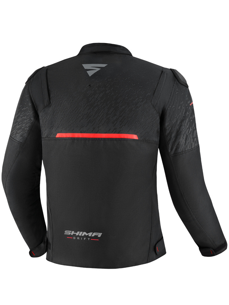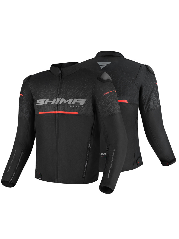 Shima Drift to lekka kurtka motocyklowa wyposażona w technologię które pozwalają na czerpanie niesamowitej przyjemności z jazdy. System wentylacji z otworami pod pachami, na przedramionach oraz na całej długości zamka głównego regulowany jest za pomocą suwaków pozwalających na swobodną regulację. Dzięki temu zastosowaniu kurtka dostarcza nam odpowiedniej ilości świeżego powietrza nawet podczas najcieplejszych letnich dni. Drift wyposażona została również w komplet certyfikowanych protektorów pleców, łokci oraz ramion które absorbują energię powstałą podczas uderzenia. Kurtka posiada również kieszeń na opcjonalny protektor klatki piersiowej (sprzedawany oddzielnie). Dodatkowym zabezpieczeniem na drodze są zewnętrzne slidery barków oraz obszerne odblaskowe panele, które zwiększają widoczność podczas jazdy nocą lub w kiepskich warunkach pogodowych. Regulacja w talii oraz przy rękawach pozwala na lepsze dopasowanie kurtki do sylwetki motocyklisty. System EvoLink przygotowuje kurtkę na zastosowanie w niej podpinki ocieplającej lub membrany. Kieszenie zewnętrzne oraz kaptur (sprzedawany oddzielnie) czyni ten model bardzo funkcjonalnym. W dolnej części kurtki umieszczony został zamek który umożliwia wygodne spięcie jej ze spodniami.
