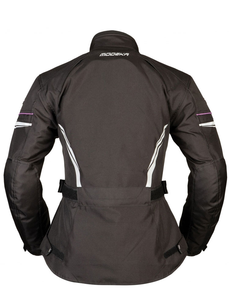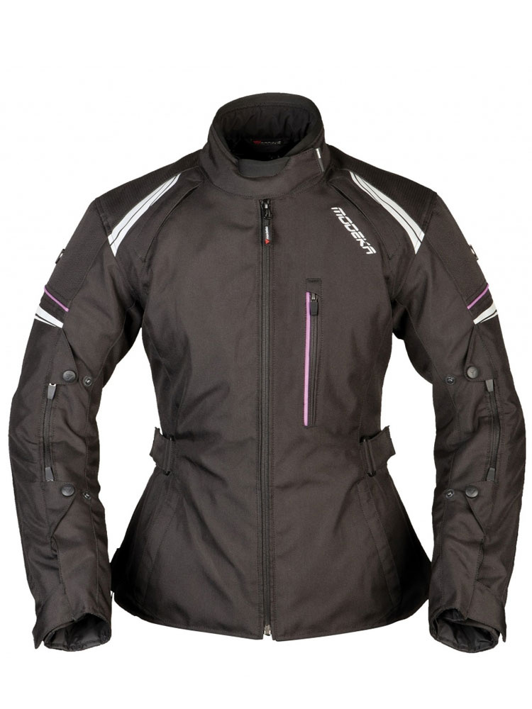 W ofercie Modeki znajduje się wodoodporna kurtka motocyklowa damska tekstylna Violetta. Posiada ona wbudowaną membranę Humax®, która zapewnia ochronę przed deszczem i wiatrem oraz wyjmowaną kamizelkę termiczną zapewniającą ciepło w chłodniejsze dni. W razie potrzeby odpowiednią cyrkulację powietrza gwarantują zamki wentylacyjne na ramionach, rękawach oraz plecach. O bezpieczeństwo dbają certyfikowane ochraniacze ramion i łokci YF oraz elementy odblaskowe 3M™ Scotchlite™ poprawiające Twoją widoczność na drodze. Poziom ochrony możesz rozszerzyć zakładając dedykowany ochraniacz pleców SAS-TEC®. Idealne dopasowanie zapewniają rzepy regulacyjne na mankietach, w pasie i na biodrach oraz napy na rękawach. Kołnierz kurtki jest wyściełany oraz posiada zapięcie z neoprenowym wykończeniem pod brodą. Praktyczny zamek pozwala na spięcie kurtki ze spodniami Violetta dzięki czemu nie będzie się przesuwać podczas jazdy motocyklem.
