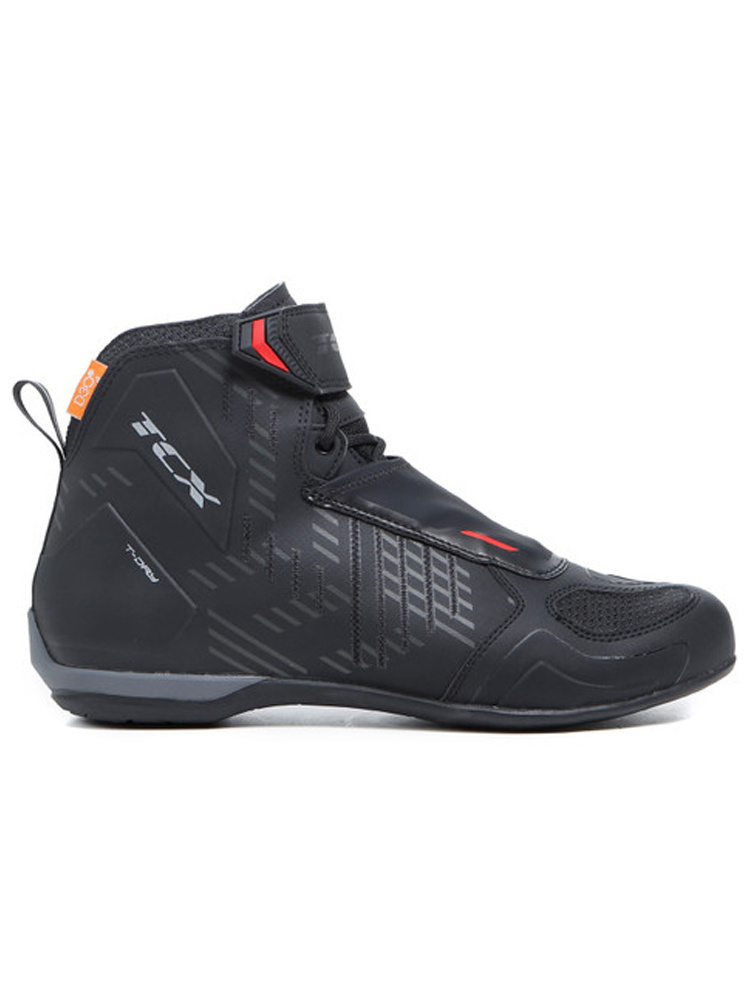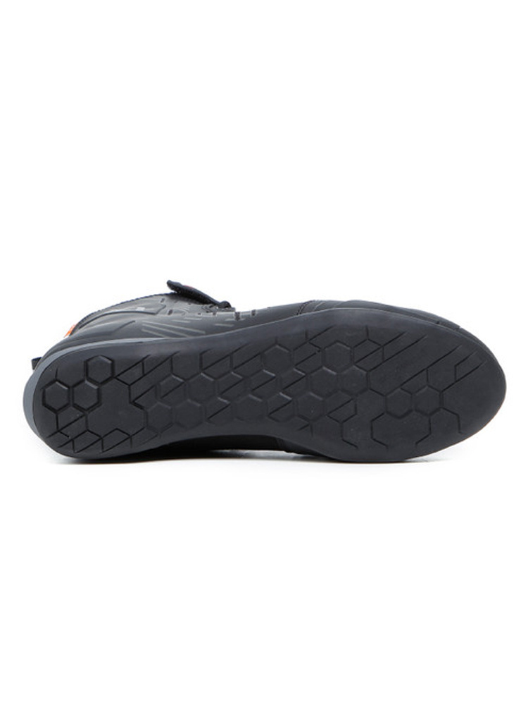 Lekkie, bezpieczne i wygodne — takie są nowe buty motocyklowe TCX R04D WP. Model ten wyposażony został w wodoodporną i oddychającą membranę T-DRY, która odpycha cząsteczki wody, utrzymując optymalny komfort wnętrza. Cholewka wykonana została z odpornej na przetarcia, rozdarcia i przebicia mikrofibry. Panele z meshowej siateczki zapewniają świetny przepływ powietrza, a wewnętrzna wkładka OrthoLite® szybko i sprawnie pozbywa się wilgoci, zapobiegając tym samym powstawaniu nieprzyjemnych zapachów. Buty motocyklowe wiązane są na trwałe sznurowadła poprawiające indywidualne dopasowanie oraz zapinane na pasek z rzepem. Absorbujące energię protektory D3O, a także wzmocnienia na palcach oraz piętach chronią najbardziej newralgiczne miejsca przed doznaniem poważniejszych urazów. Odblaskowe elementy zadbają o nasze bezpieczeństwo pasywne podczas jazdy po zmroku. Przód cholewki wyposażony został w skórzaną wstawkę ułatwiającą operowanie dźwignią zmiany biegów. Podeszwę natomiast, wykonano z odpornej na zużycie gumy ze specjalnym bieżnikiem zapewniającym wyjątkową przyczepność do każdej nawierzchni.
