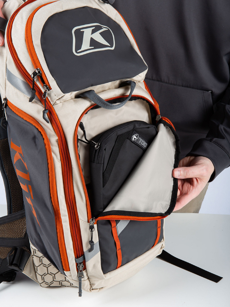 - Zewnętrzna kieszeń dolna zapinana na zamek z wyjmowaną wodoodporną torbą i zintegrowanym panelem organizacyjnym, klipsem na klucze