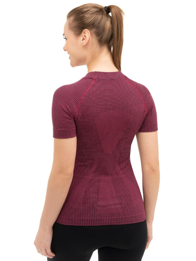 Koszulka termoaktywna damska 3D PRO z krótkim rękawem została wykonana w technologii bezszwowej, z cienkiej, dwuwarstwowej dzianiny. Jej konstrukcja powstała na bazie modelu wzmocnionej trójwymiarowej siatki o przestrzennej budowie, która zwiększa powierzchnię odbioru wilgoci. W miejscach o wzmożonej potliwości zastosowano modyfikowane sploty, tworzące kanały powietrzne, poprawiające cyrkulację wewnątrz struktury. Odzież wpływa na regulację temperatury ciała, chroniąc je przed przegrzaniem lub wyziębieniem. Dopasowany krój chroni przed otarciami i powoduje, że produkt nie krępuje ruchów. Dzianina ma właściwości antyalergiczne i bakteriostatyczne. Produkt jest przeznaczony do biegania oraz wszystkich aktywności fizycznych w wyższych temperaturach