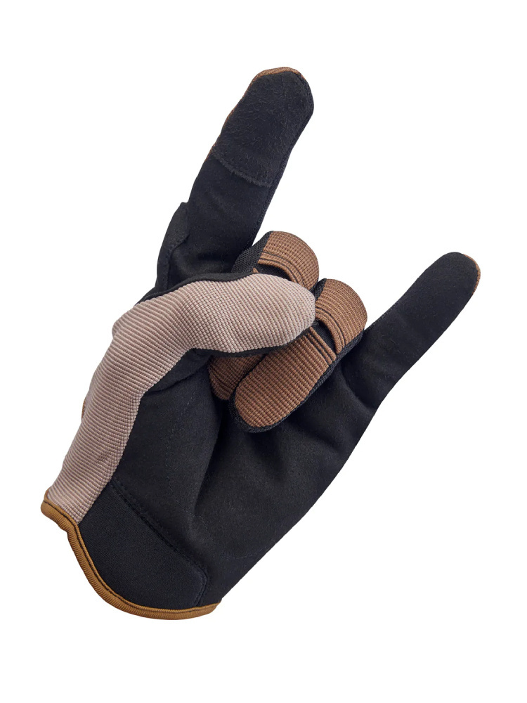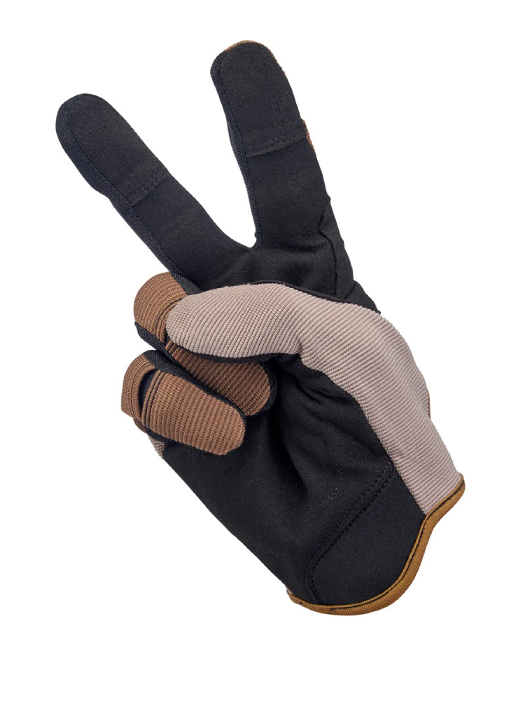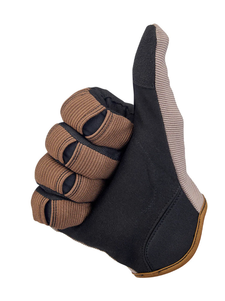 Zaprojektowane do jazdy, jak i pracy przy motocyklu rękawice crossowe Moto marki Biltwell oferują przewiewność, wygodne dopasowanie i doskonałe czucie. Stworzone do jazdy latem oraz wiosną. Pod względem konstrukcyjnym wykonane są z wierzchu z elastycznego i oddychającego poliestru stretch oraz na dłoni z wytrzymałej i odpornej na uszkodzenia syntetycznej skóry. Dla zapewnienia maksymalnej mobilności pomiędzy palcami umieszczono elastyczną lycrę, natomiast na palcach rozciągliwe panele. Takie rozwiązanie sprawia, że rękawice gwarantują doskonałą mobilność, niczym nieskrępowane ruchy palców. Dzięki temu bez problemu ułożysz dłoń na manetce, obsłużysz osprzęt motocykla czy weźmiesz klucze, aby naprawić motocykl. O solidnej konstrukcji świadczą mocne szwy zastosowane w całej rękawicy oraz podwójne szwy w miejscach najbardziej narażonych na uszkodzenia. Model Moto cechuje się krótkim mankietem wykończonym przyjaznym dla skóry materiałem. Zapinany jest na mocny rzep, który posiada osłonę z termoplastycznej gumy z logo Biltwell. Atrakcyjność rękawic podnosi możliwość obsługi smartfona i nawigacji oraz szeroka gama kolorów.
