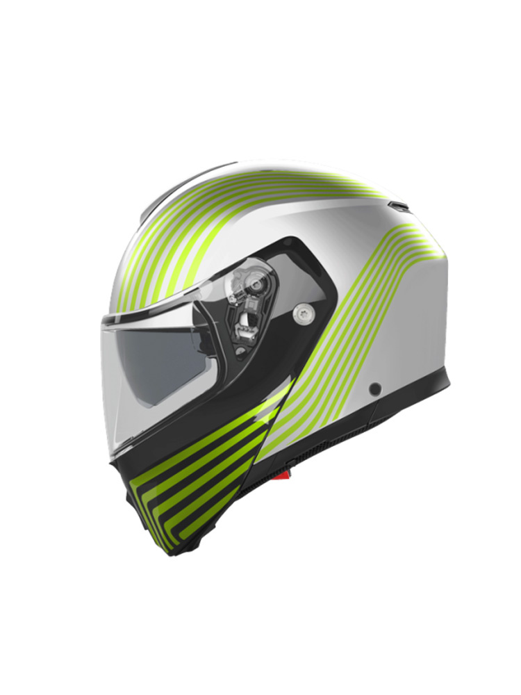 AGV Streetmodular to szczękowy kask motocyklowy, który sprawi, że podróże motocyklowe wskoczą na zupełnie inny poziom. Cała konstrukcja wyróżnia się solidnością i wytrzymałością, dzięki zastosowaniu tworzywa termoplastycznego HIR-TH (High Resistance Thermoplastic). W aspekcie bezpieczeństwa warto również wspomnieć o tym, że w wewnętrznej części kasku znajdziemy piankę EPS dostępną w trzech rozmiarach. Pozostając przy temacie wnętrza kasku szczękowego Streetmodular należy wspomnieć o antybakteryjnej wyściółce 2Dry, która odpowiada za optymalne odprowadzanie wilgoci. Ponadto jest ona w pełni wyjmowana, dzięki czemu w łatwy sposób można ją poddać procesowi prania. Istotnym elementem tego modelu jest odporny na zarysowania (powłoka Anti-Scratch) wizjer, który przystosowano do montażu Pinlocka (dostępny w zestawie). Za pomocą mechanizmu XQRS (Extra Quick Release System) szybkę można błyskawicznie wymienić bez użycia narzędzi, a cały proces potrwa zaledwie kilka sekund. Projektanci kasku pomyśleli również o podróżowaniu motocyklem w słoneczne dni, dlatego w tym modelu znajdziemy również blendę przeciwsłoneczną. W kasku szczękowym AGV Streetmodular mamy do czynienia z zapięcie mikrometrycznym, które jest bardziej znane pod nazwą MicroLock.