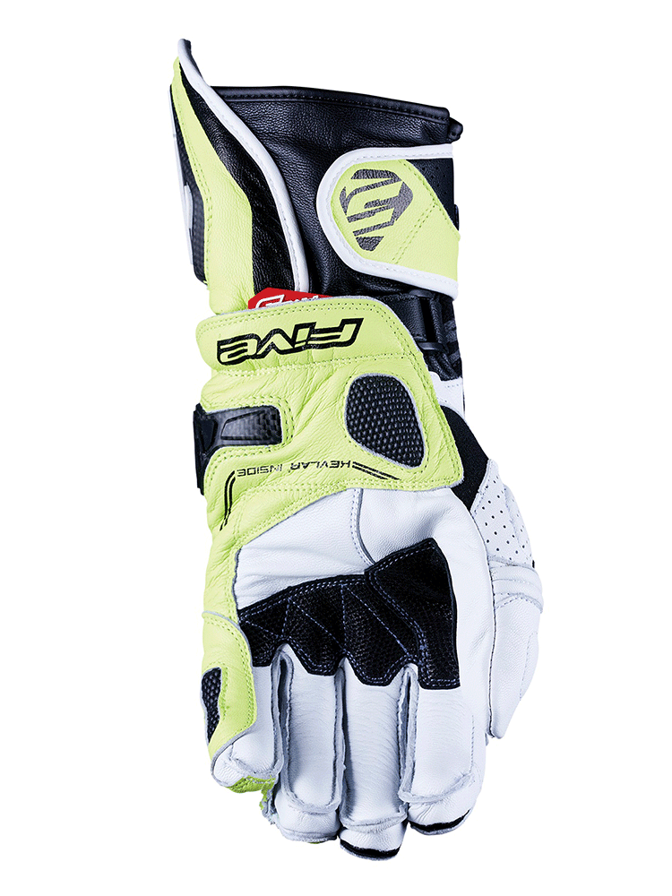 Rękawice motocyklowe skórzane Five Rfx1 Race są dostosowane do intensywnej aktywności podczas sportowej jazdy motocyklowej. Uszyte z zewnątrz z bydlęcej skóry odpornej na rozerwania i silne wstrząsy, a dodatkowo we wnętrzu z koziej skóry, która doskonale przylega do dłoni i ułatwia sterowanie manetką. Wewnętrzna wyściółka i panel zewnętrzny z włókna aramidowego gwarantuje ochronę termiczną oraz wytrzymałość mechaniczną, ognioodporność i odporność chemiczną. Co więcej, wzmocnienia nadgarstka oraz protektory paliczków wykonane z TPU zapewniają zabezpieczają dłoń podczas upadku. Wygodne i dopasowane rękawice motocyklowe skórzane Five Rfx1 Race zostały wyposażone w zewnętrzne szwy z nici Gütermann, które zapobiegną rozpruwaniu się skóry na palcach, a dodatkowo regulowane zapięcie umożliwi idealne dopasowanie rękawic do dłoni.